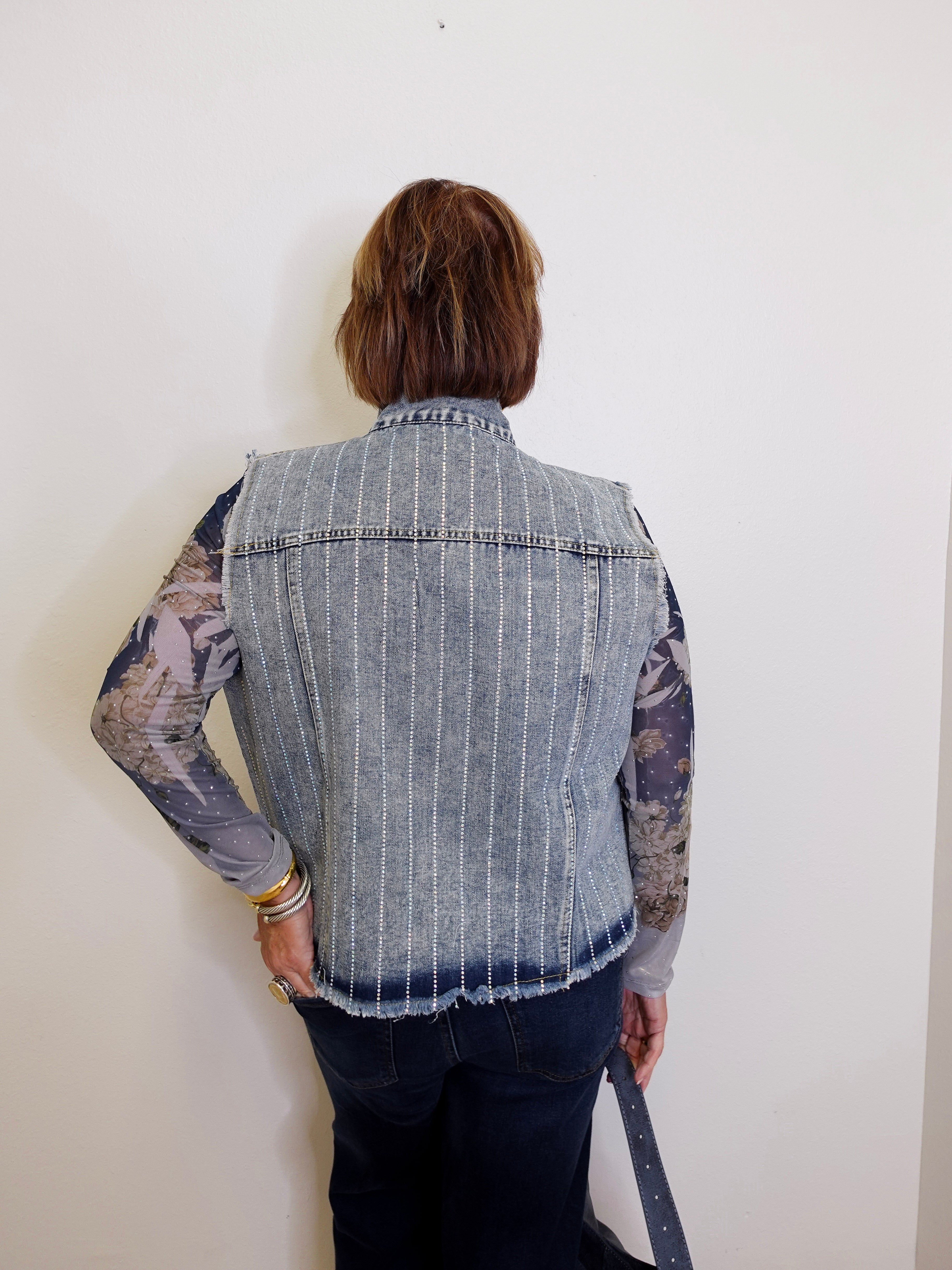 This isn’t your ordinary denim vest — it’s a show-stopper! Featuring shimmering hotfix detailing that catches the light just right, this piece brings a little glam to your classic denim look. The structured fit, snap-front design, and raw hemline give it a trendy edge while staying true to timeless jean-jacket style.