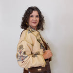 Elevate your layering game with this beautifully crafted jacket, designed in a rich cotton blend with subtle metallic threads that add just the right amount of shimmer. Featuring intricate block-print floral patterns and a timeless button-front closure, this jacket combines artisanal charm with everyday wearability.