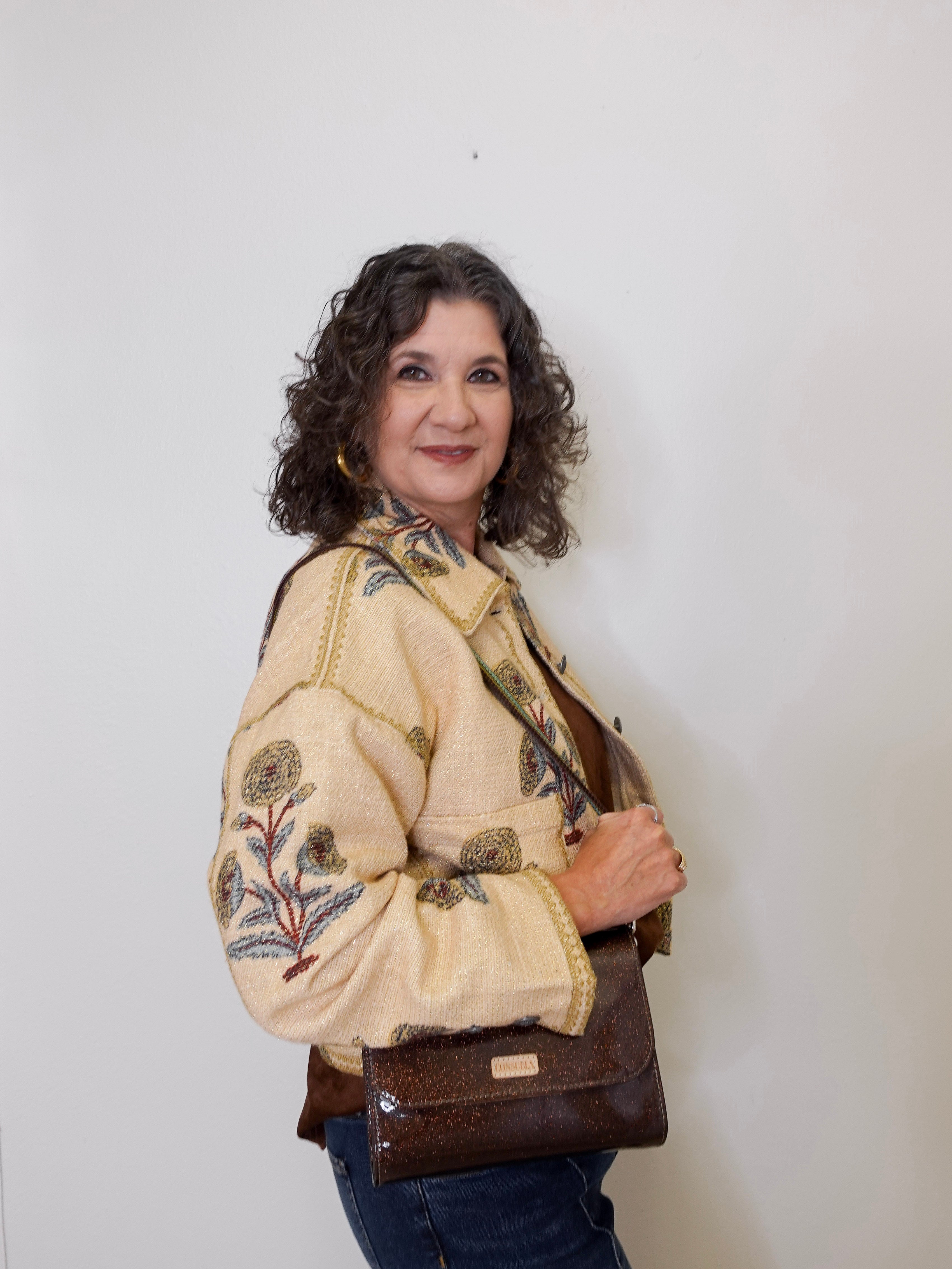 Woman wearing a gold jacket with a floral print on it, holding a brown bag against a white background.