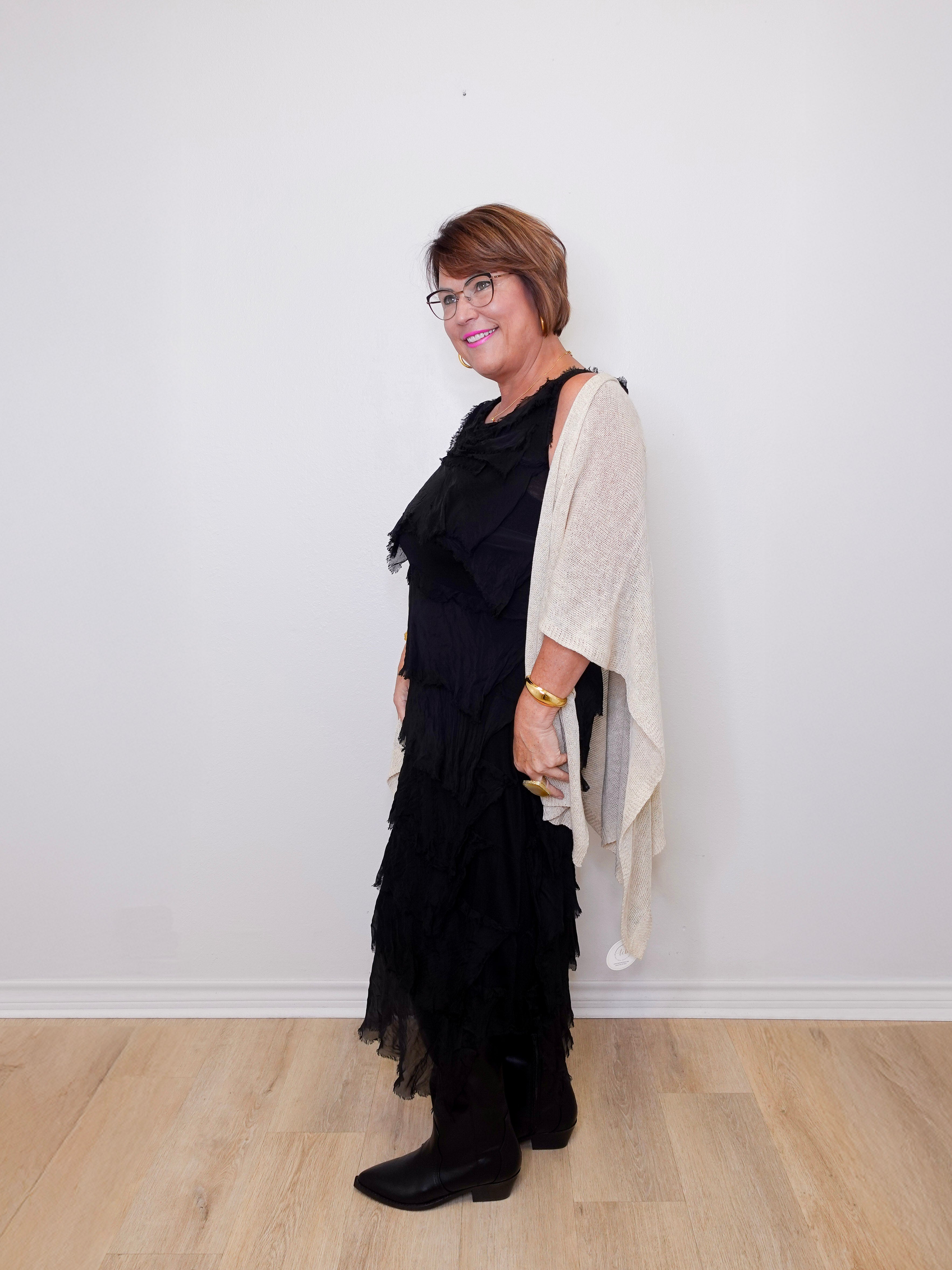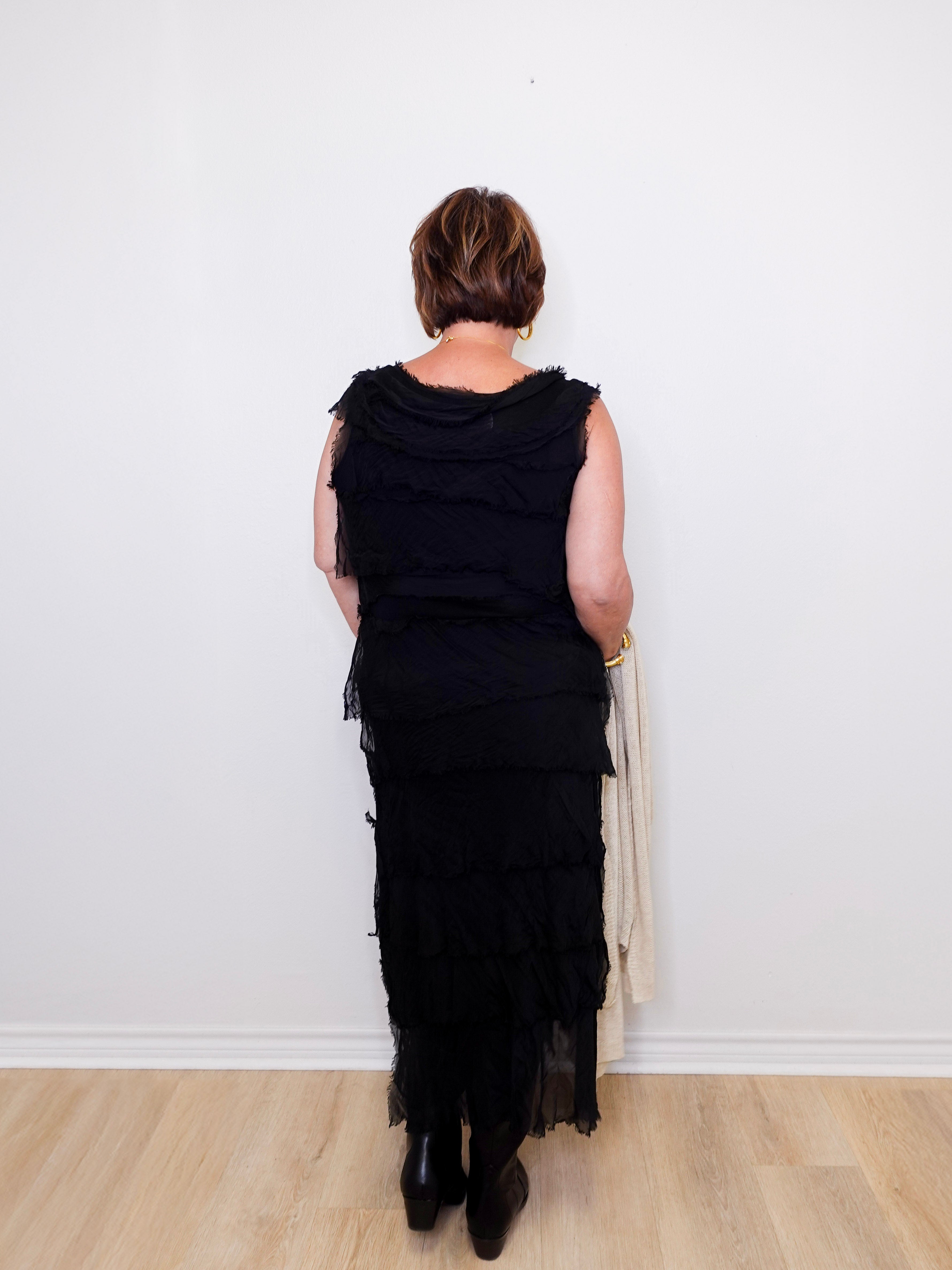 - Ruffles for days! This full-length dress can command cocktail hour or an evening soiree alike. The tiers of silk ruffles have soft edges and sweeping movement as you glide across the floor. The buttery Viscose lining will indeed surprise you! Another secret? You can wear Aleena with the scoop neckline as-is or reverse her to have a high neck front and a pretty dip in the back. Made in Italy.