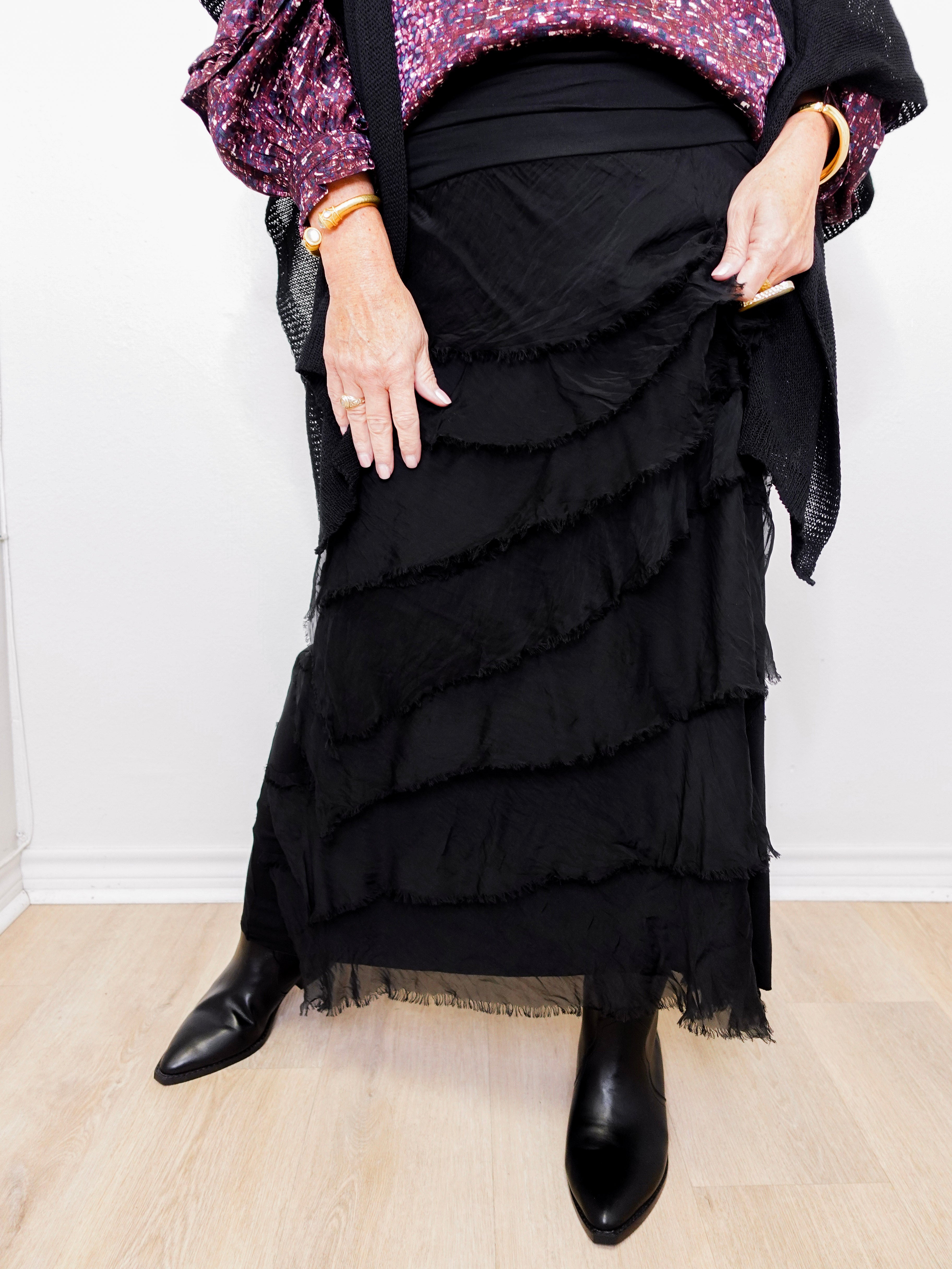 This flattering, tiered ruffle skirt feels like a dream! Wear her low on the hips for a longer length or up on the waist for a shorter look. The soft, fold down waistband makes it a snap. She’s so versatile, you can pull her up and wear as a dress! Made in Italy.