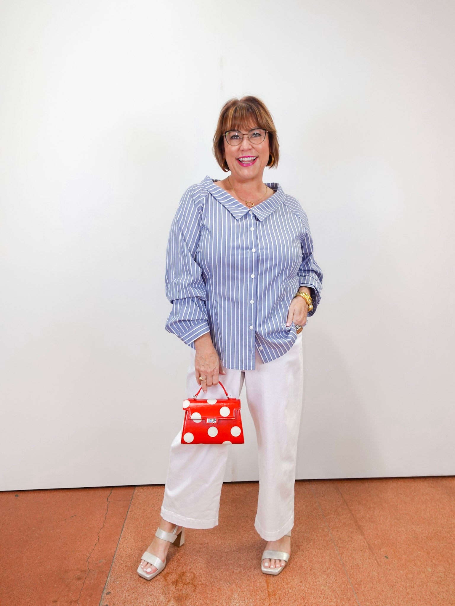 Woman wearing a blue striped shirt and white pants, holding a red polka dot bag against a white wall.
