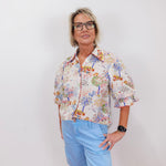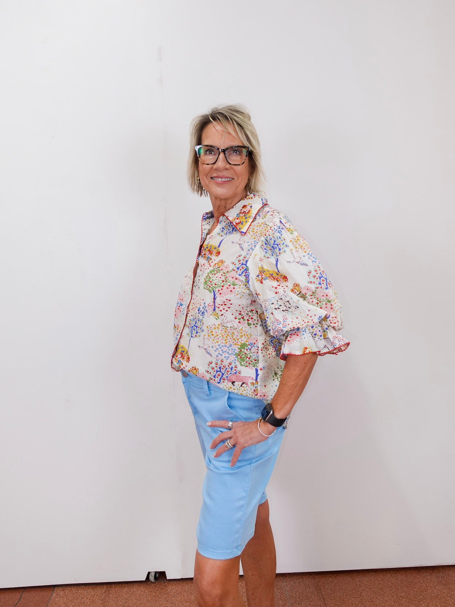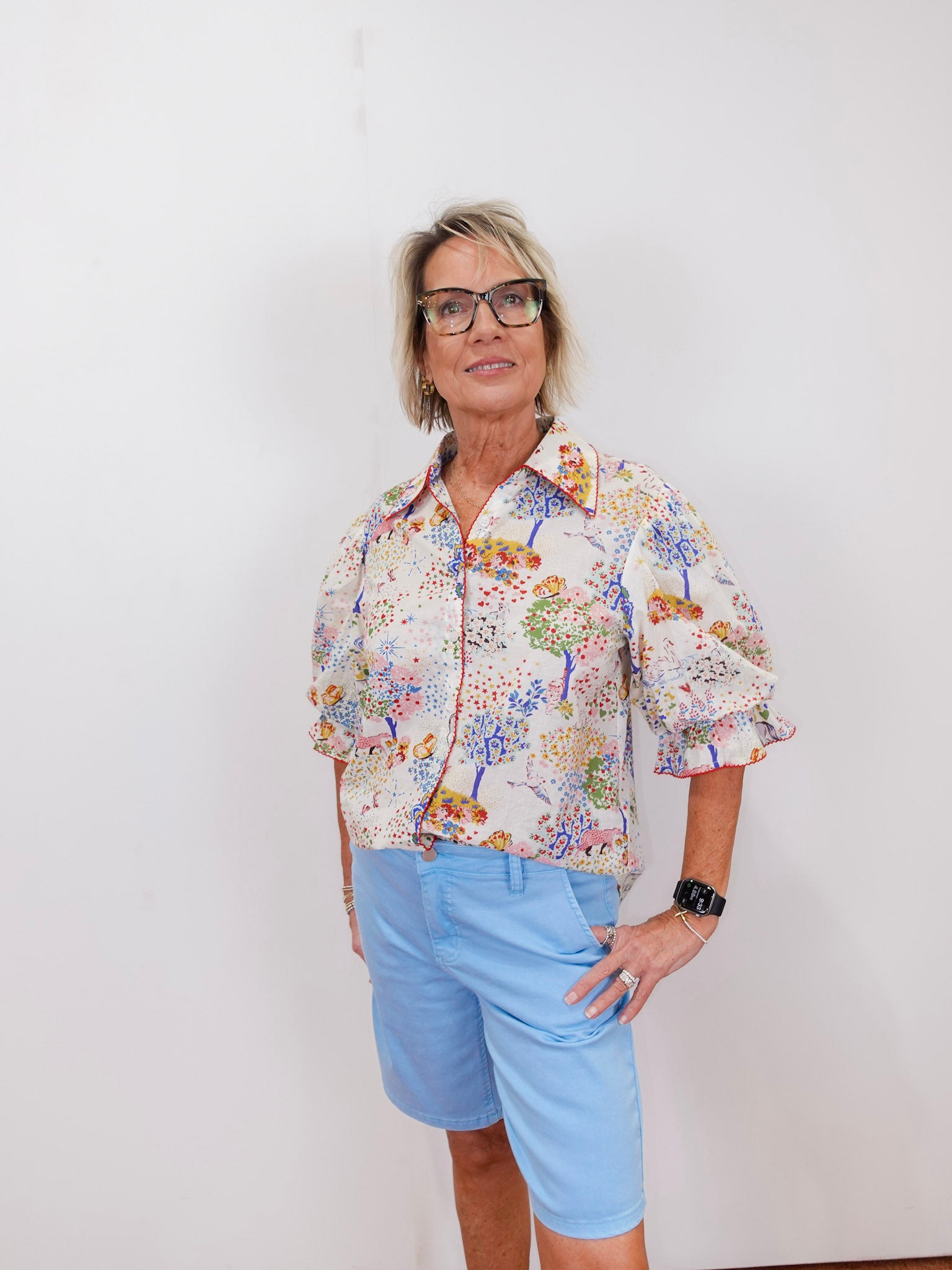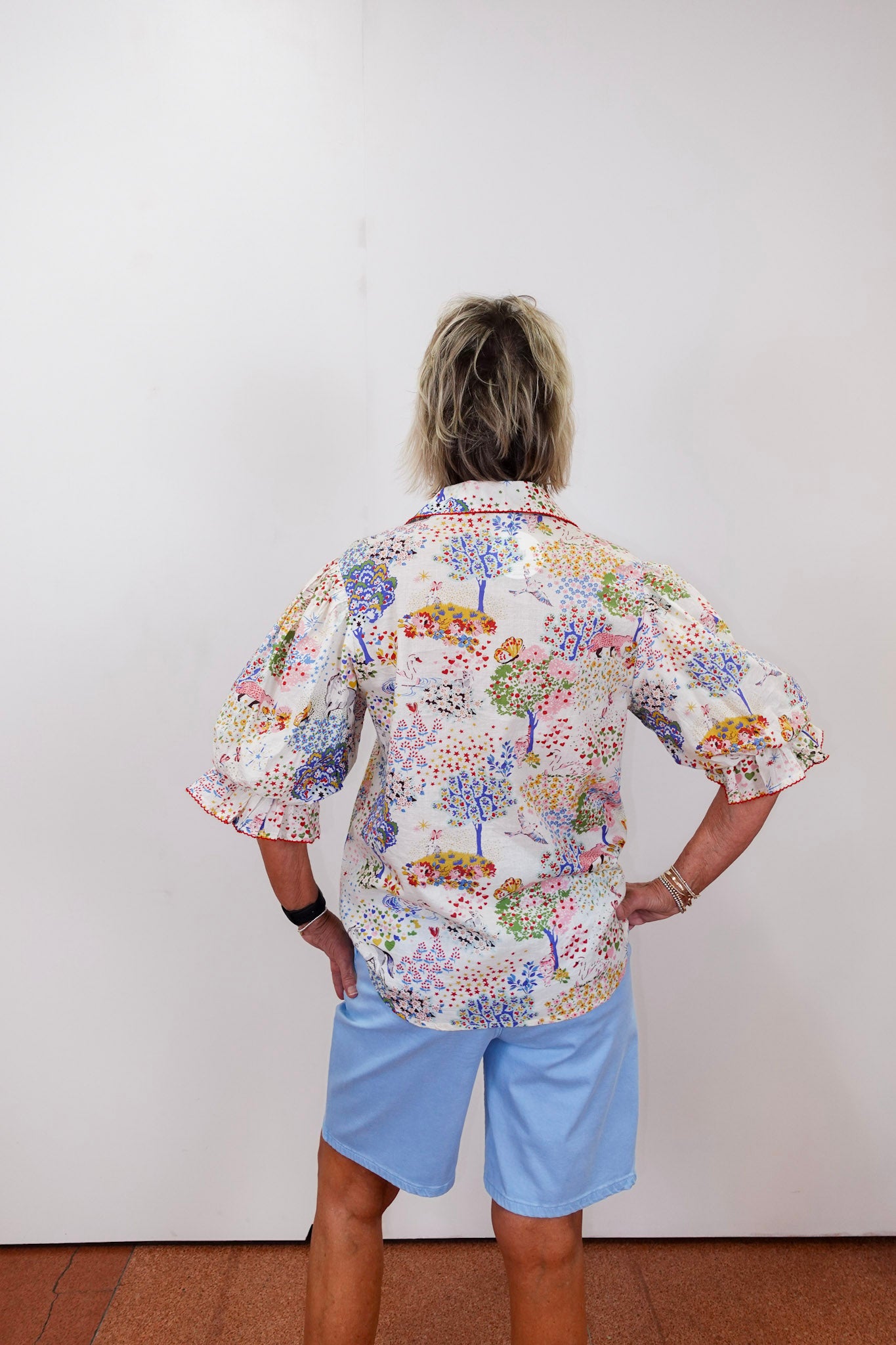 Covered in a playful, storybook-inspired print with colorful trees, florals, and charming little details, this top instantly brightens your day (and everyone else’s). The button-front silhouette keeps it classic, while the soft puff sleeves with delicate ruffle trim add that feminine flair we all love. Finished with subtle contrast edging along the placket and sleeves, it’s the kind of piece that feels special the moment you put it on.
