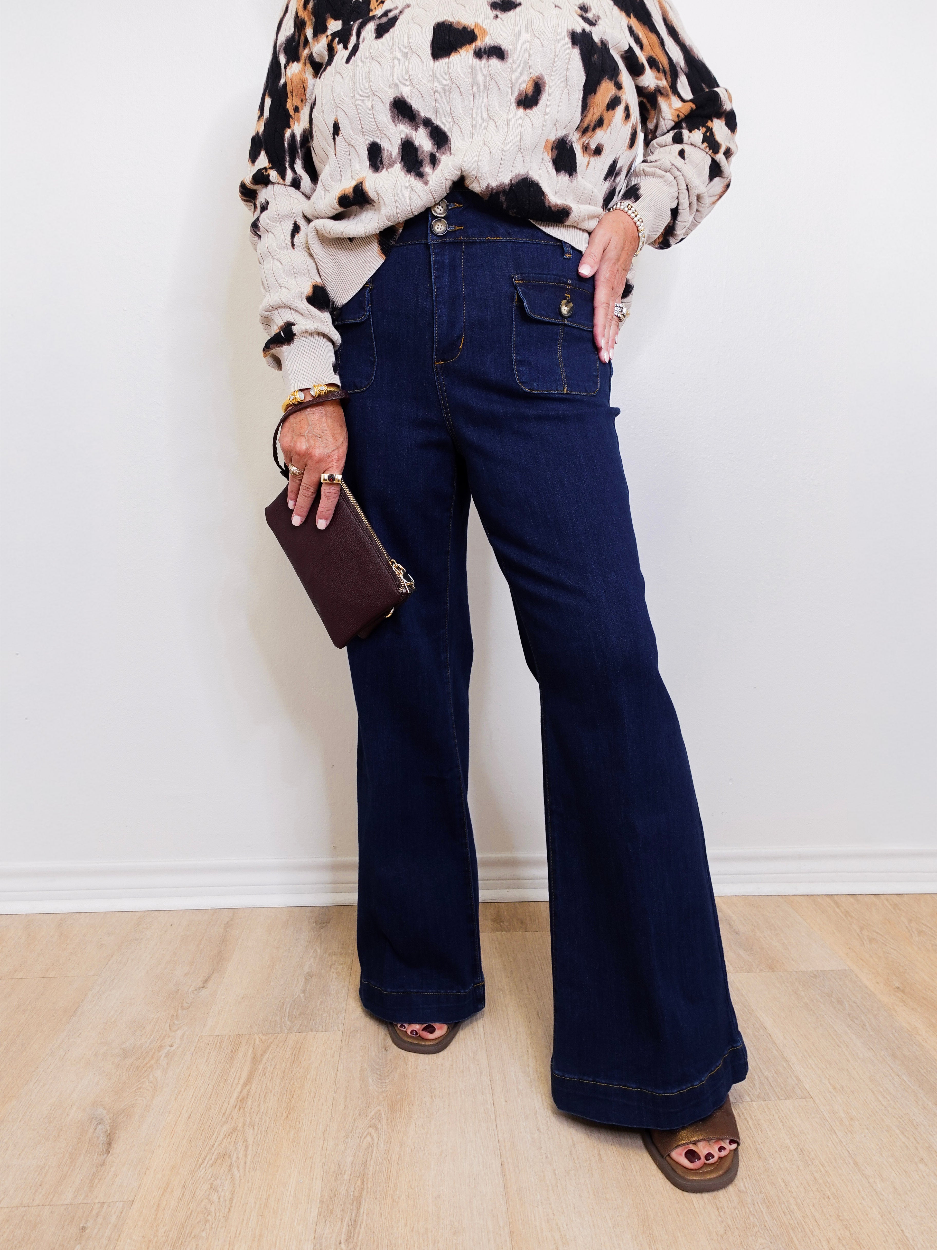 Refine your everyday wardrobe with our fashion statement jeans, designed with a flowing palazzo leg and sophisticated crease detail that enhances your silhouette. The fitted upper flatters your figure, while the zip and horn button closure add timeless elegance. Crafted with stretch denim, they offer luxurious comfort and flexibility, ensuring effortless style from day to night.