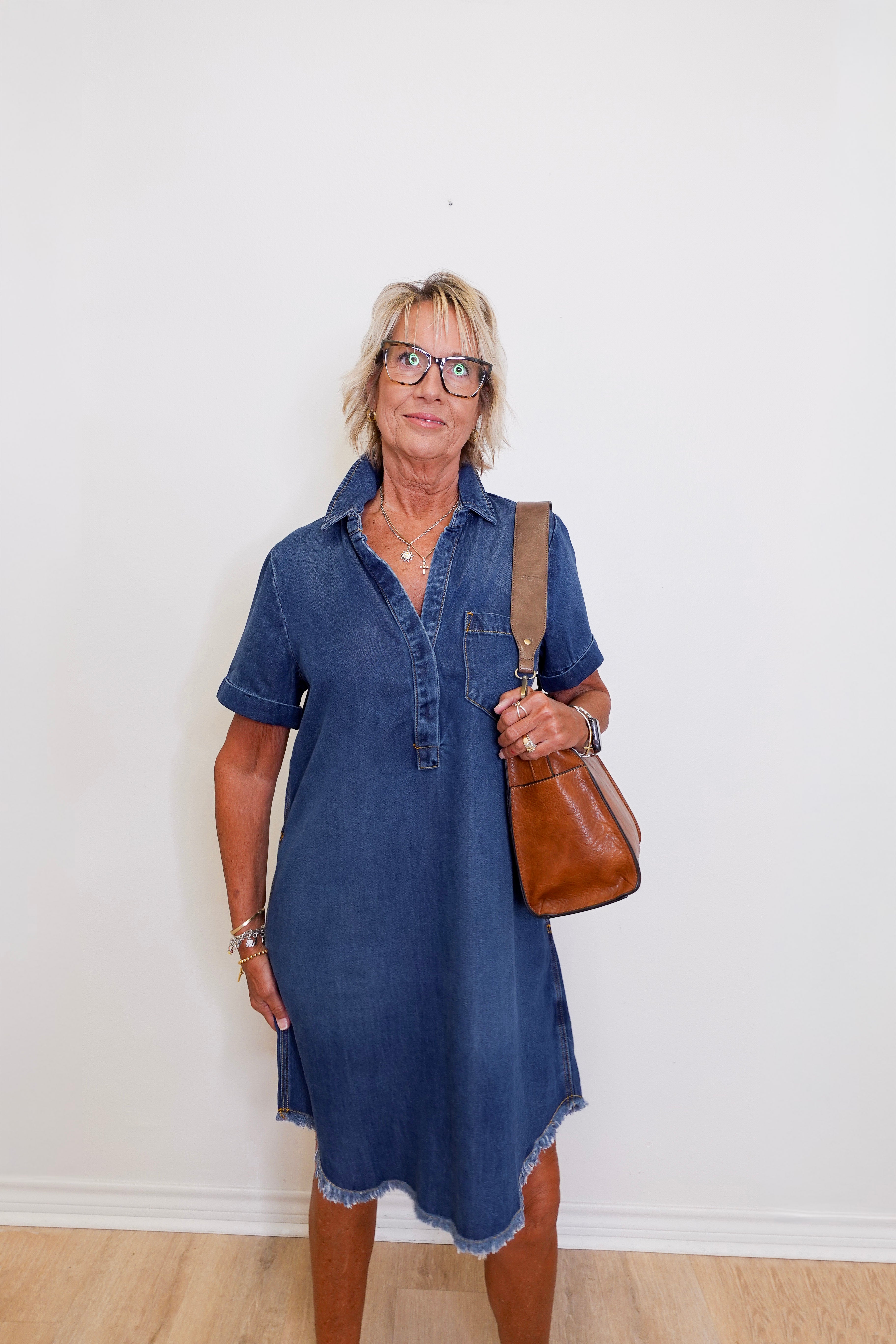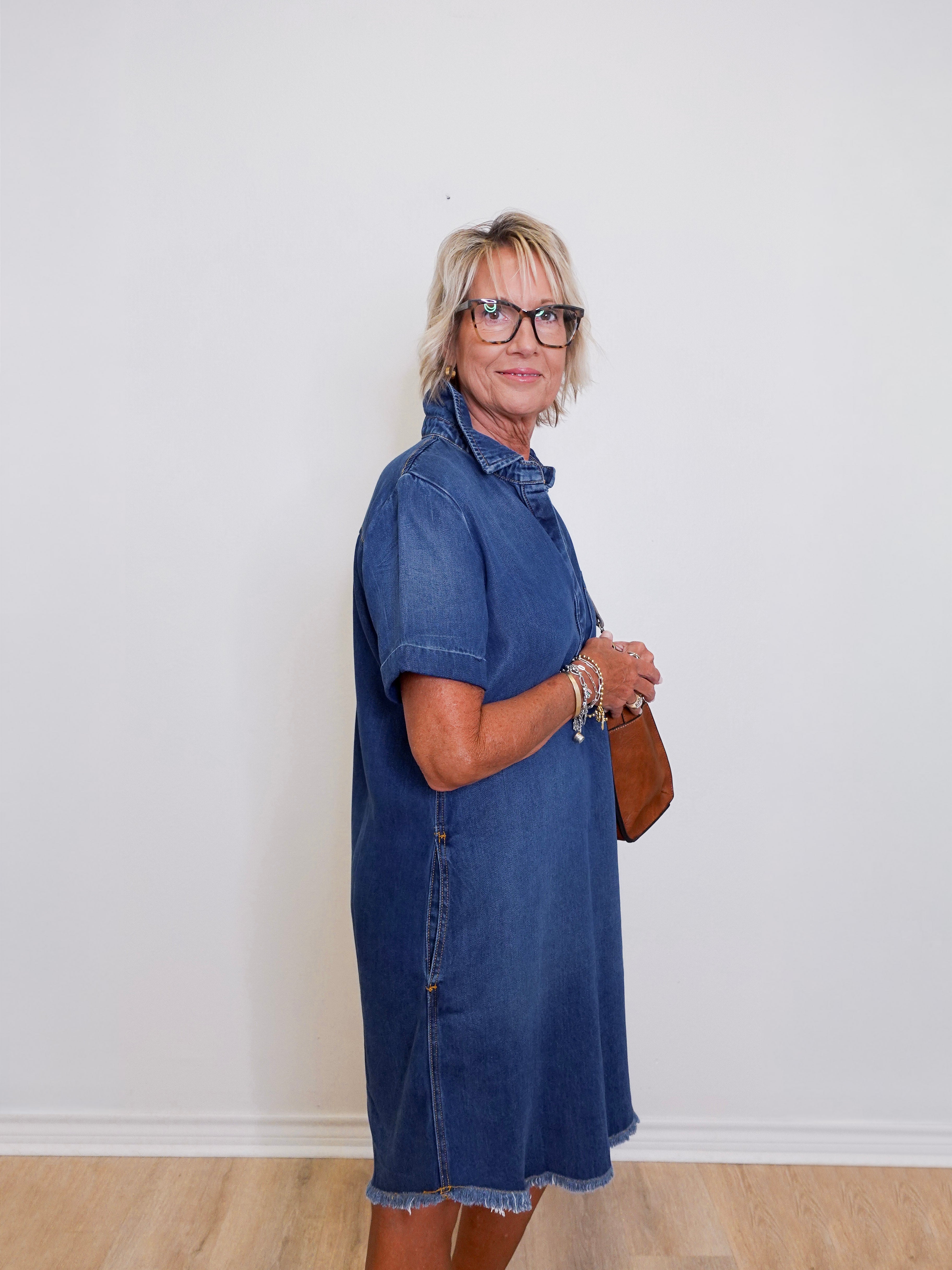Embrace effortless style in this pop-over shirt dress, featuring a buttoned placket with a Johnny collar accent for a touch of charm. Cuffed short sleeves keep it breezy and cool, while the frayed hem adds a relaxed finish. Crafted from flowy lyocell twill, this dress ensures comfort and movement throughout the day, making it a perfect addition to your timeless wardrobe for day-to-night looks.
