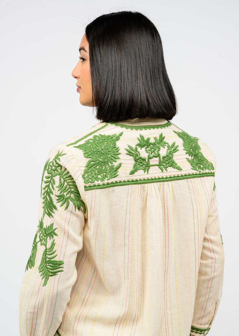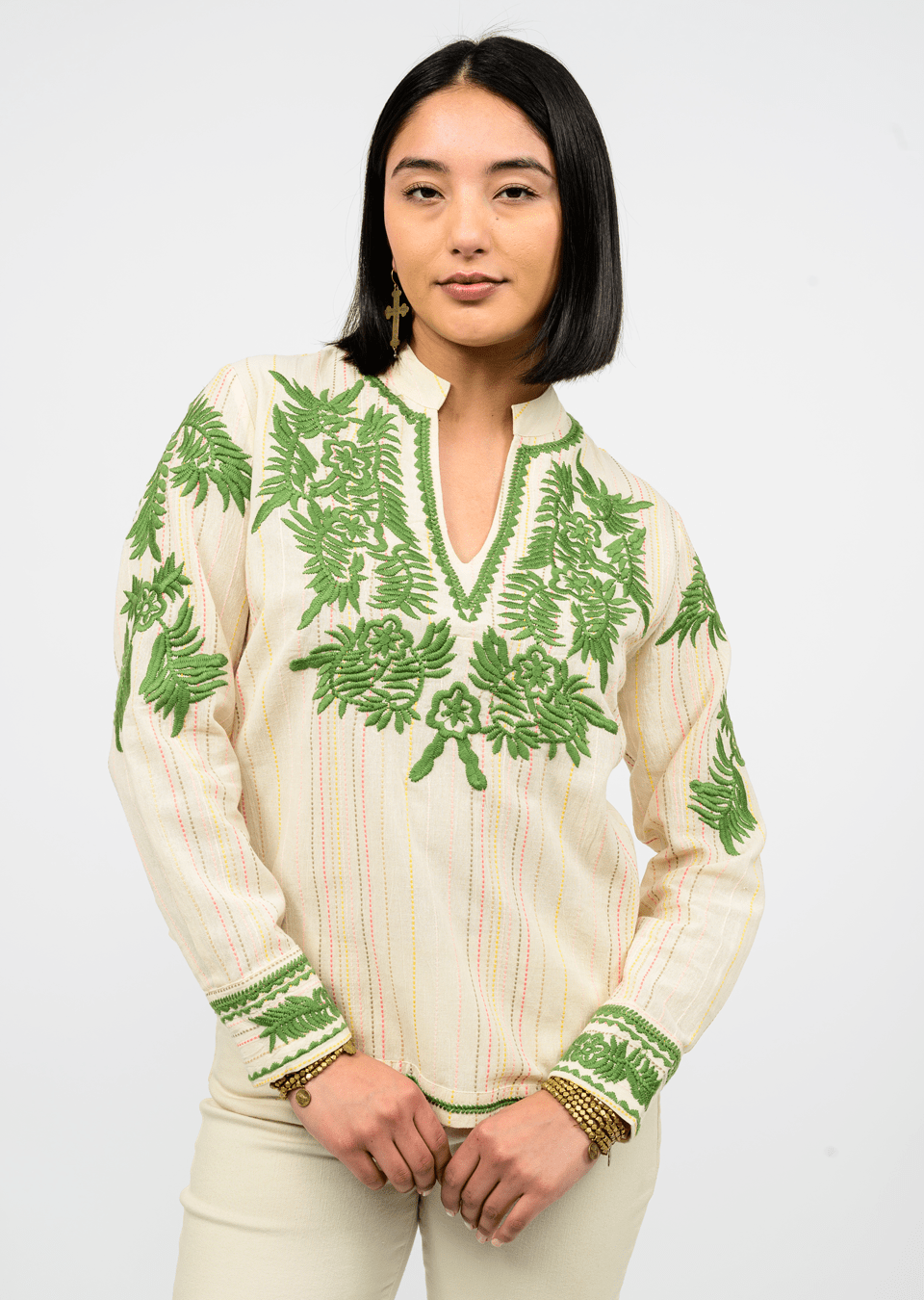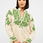 This effortlessly chic blouse features lush green floral embroidery that pops against a soft cream background.