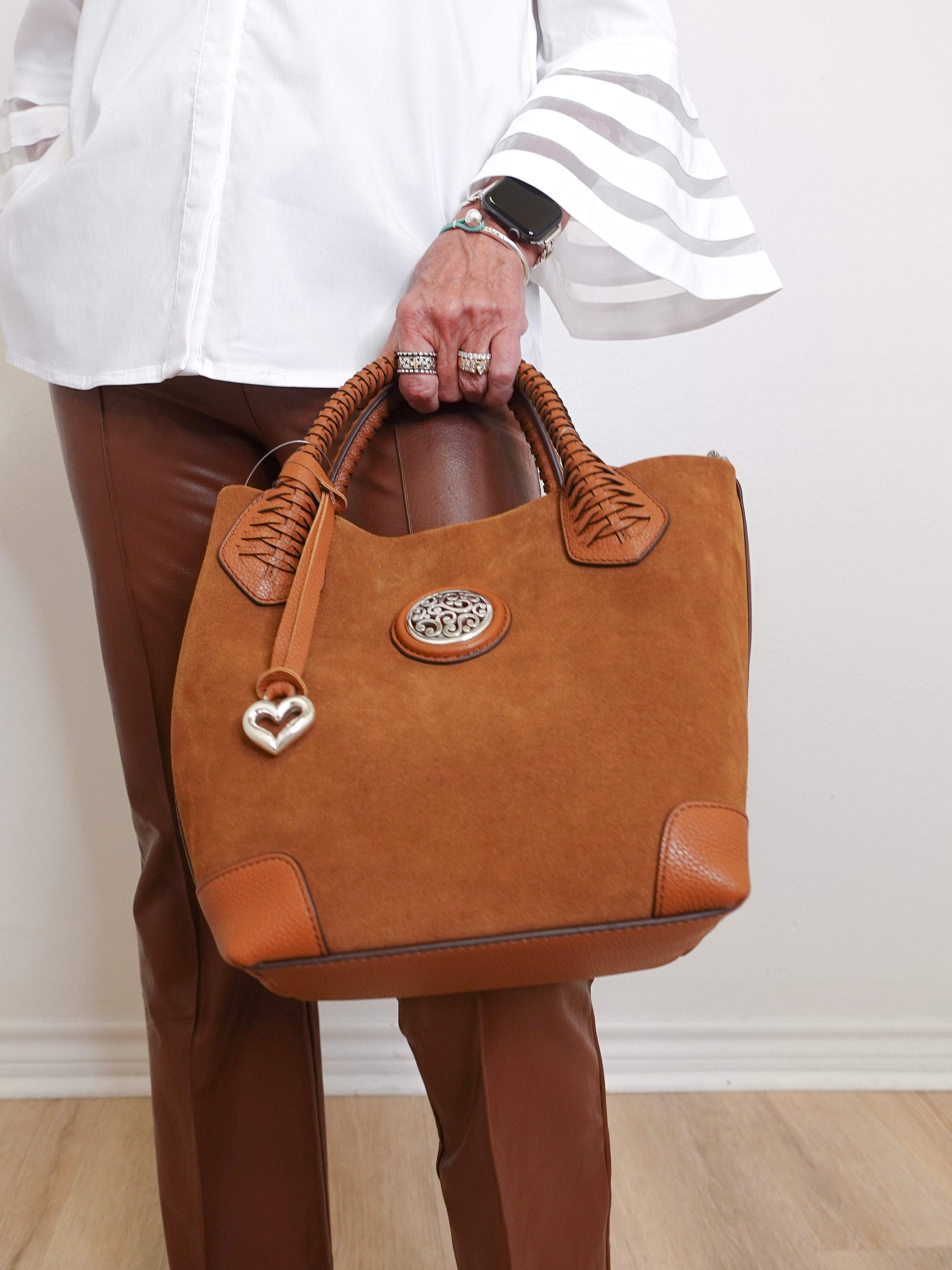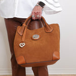 Brown suede handbag with leather handles and decorative emblem worn by a person against a white background