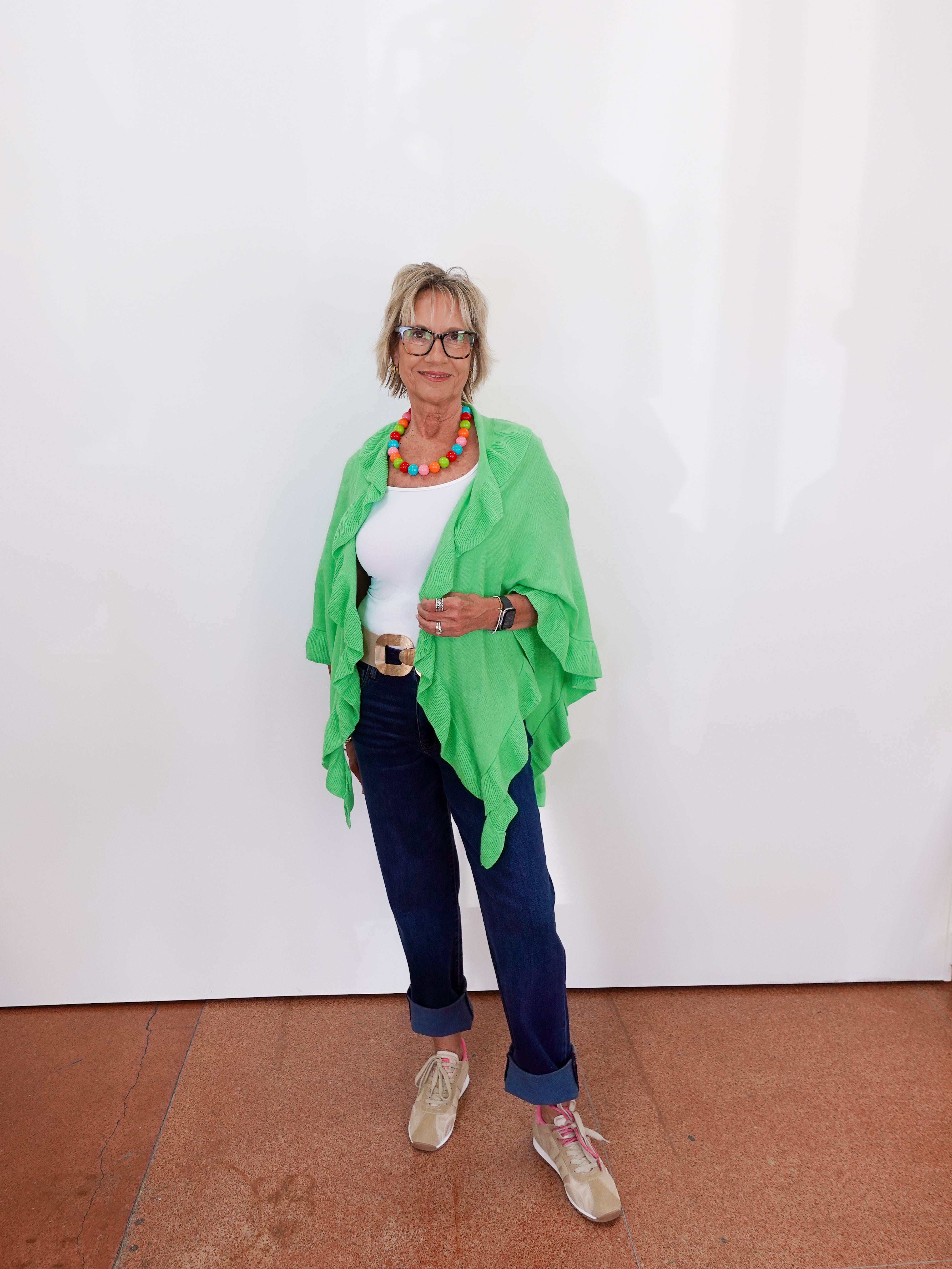 Woman wearing a green cardigan, white top, and blue jeans against a white background