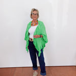 Woman wearing a green shawl over a white top and blue jeans against a white background