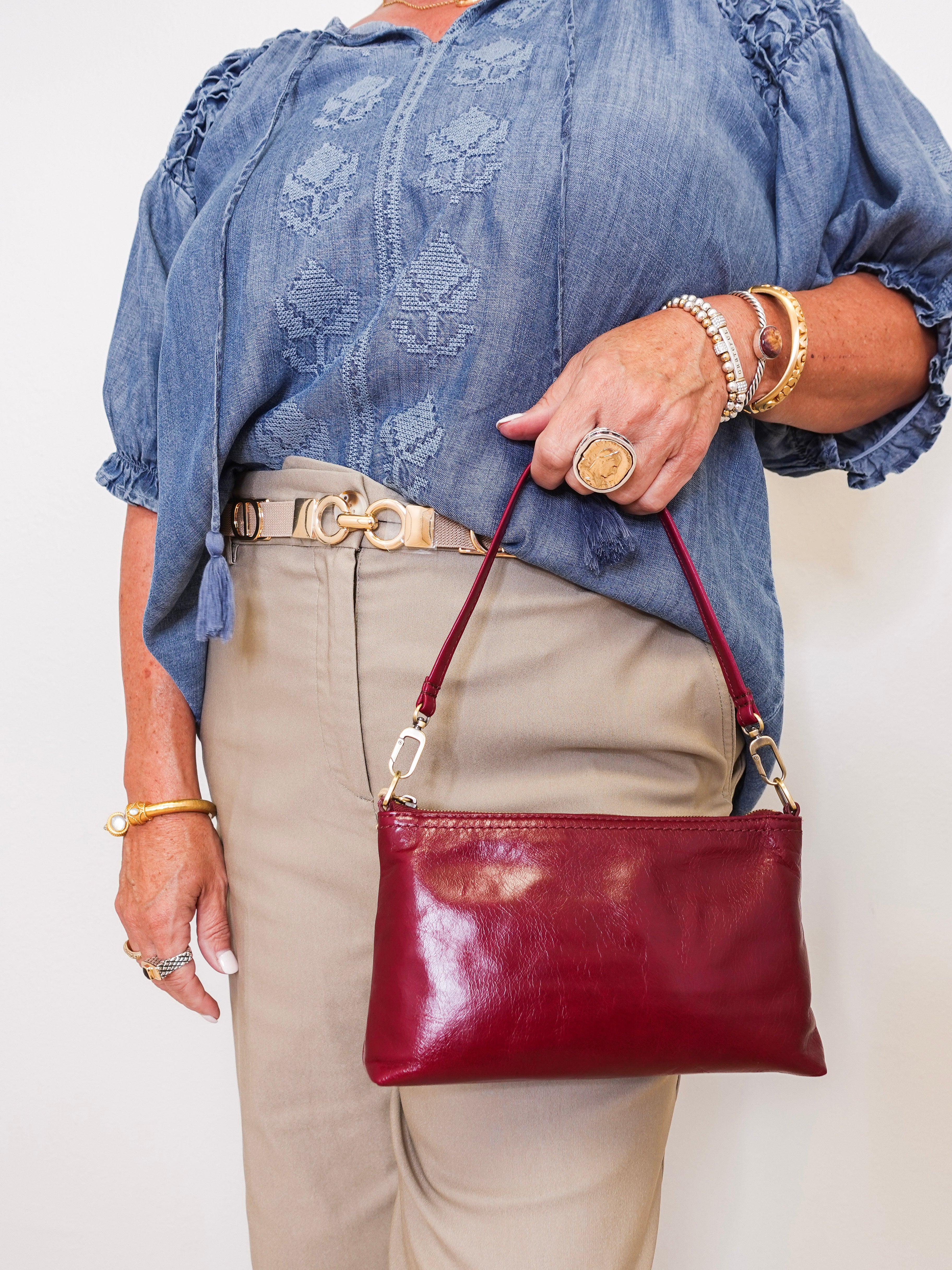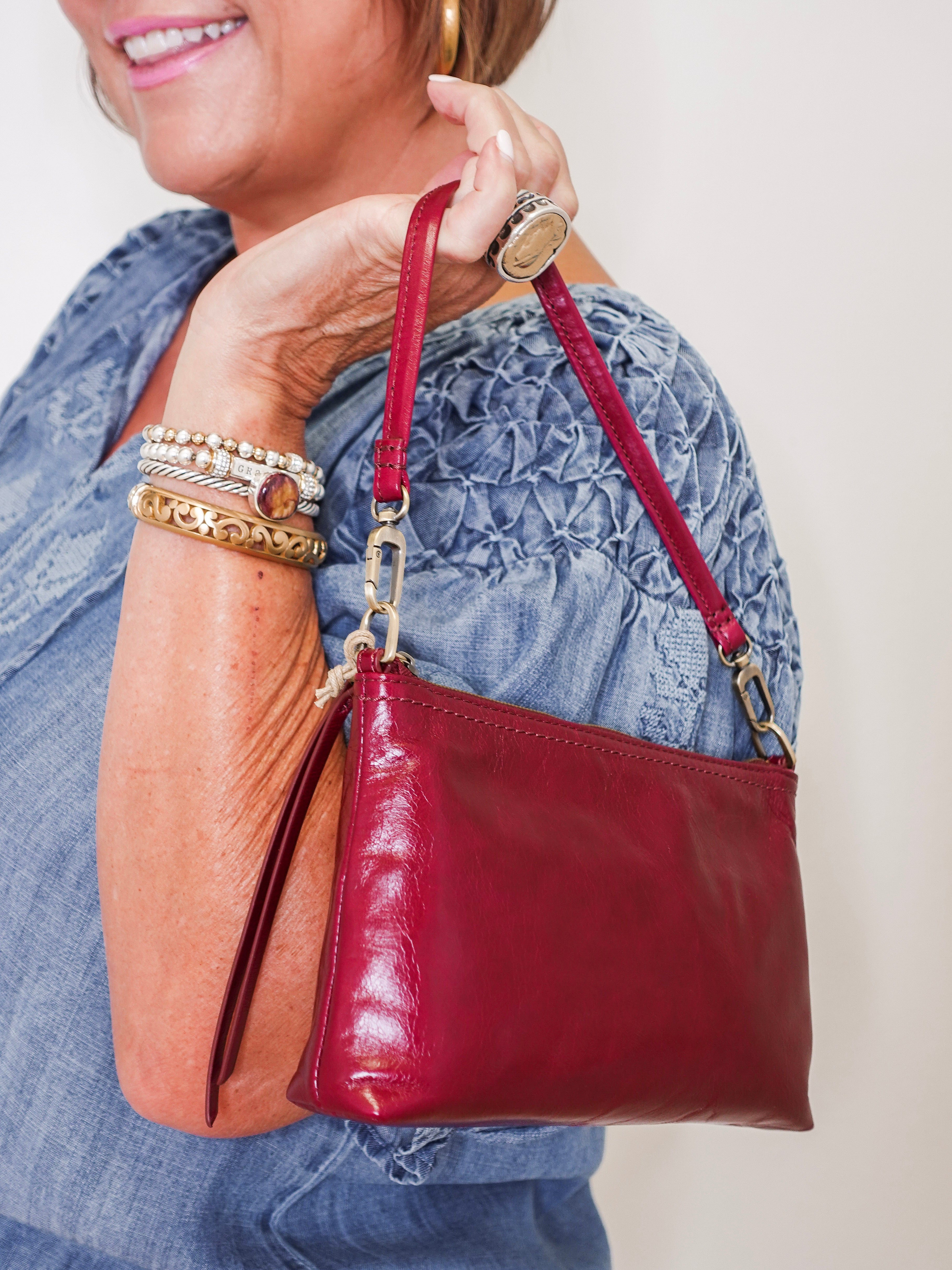 An iconic and convertible HOBO style that can be worn three ways: crossbody, baguette bag and wristlet.
