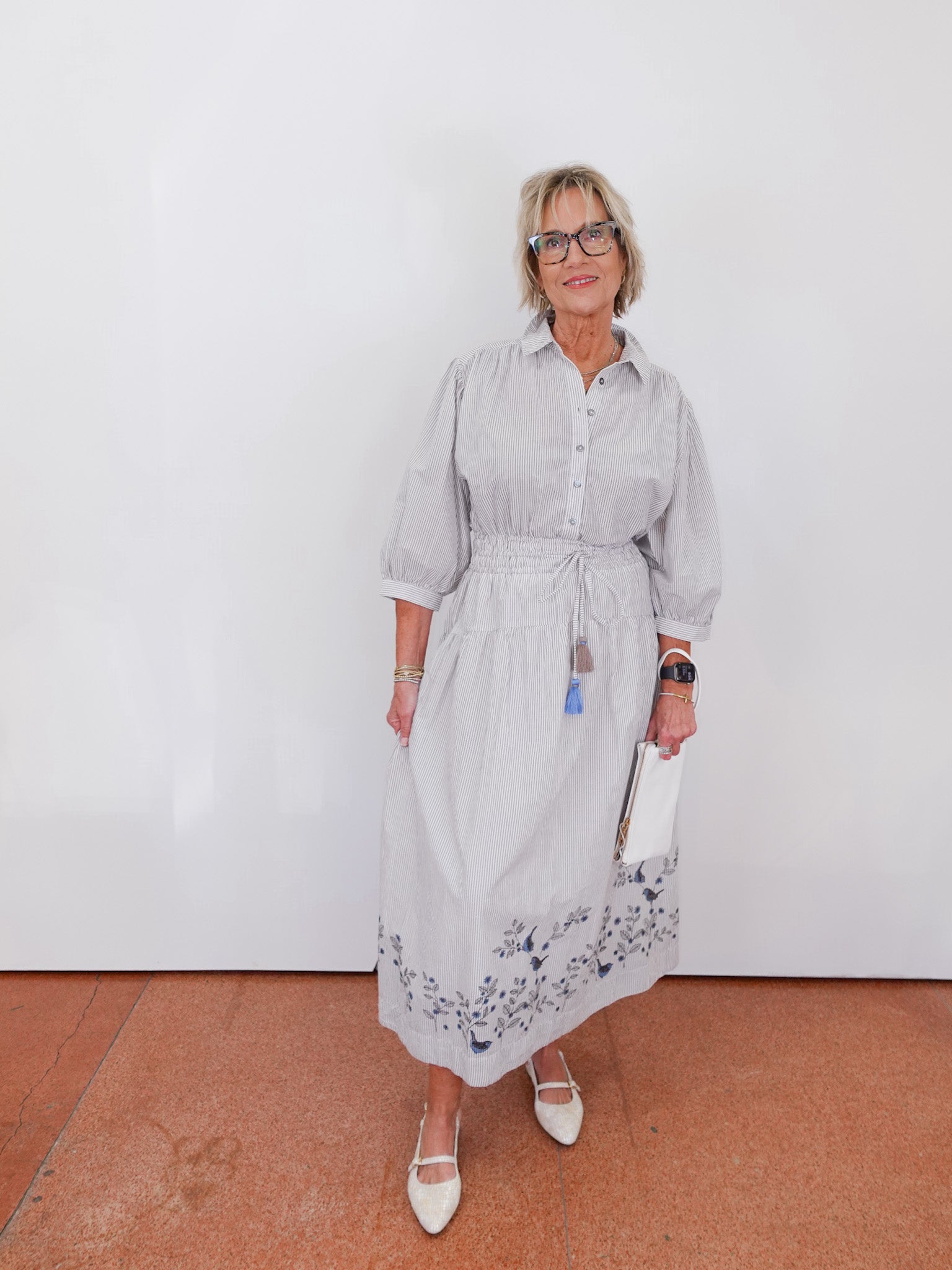 A timeless silhouette with the sweetest unexpected detail. This striped khaki midi features delicate bird-and-vine embroidery along the hem — subtle from afar, stunning up close.