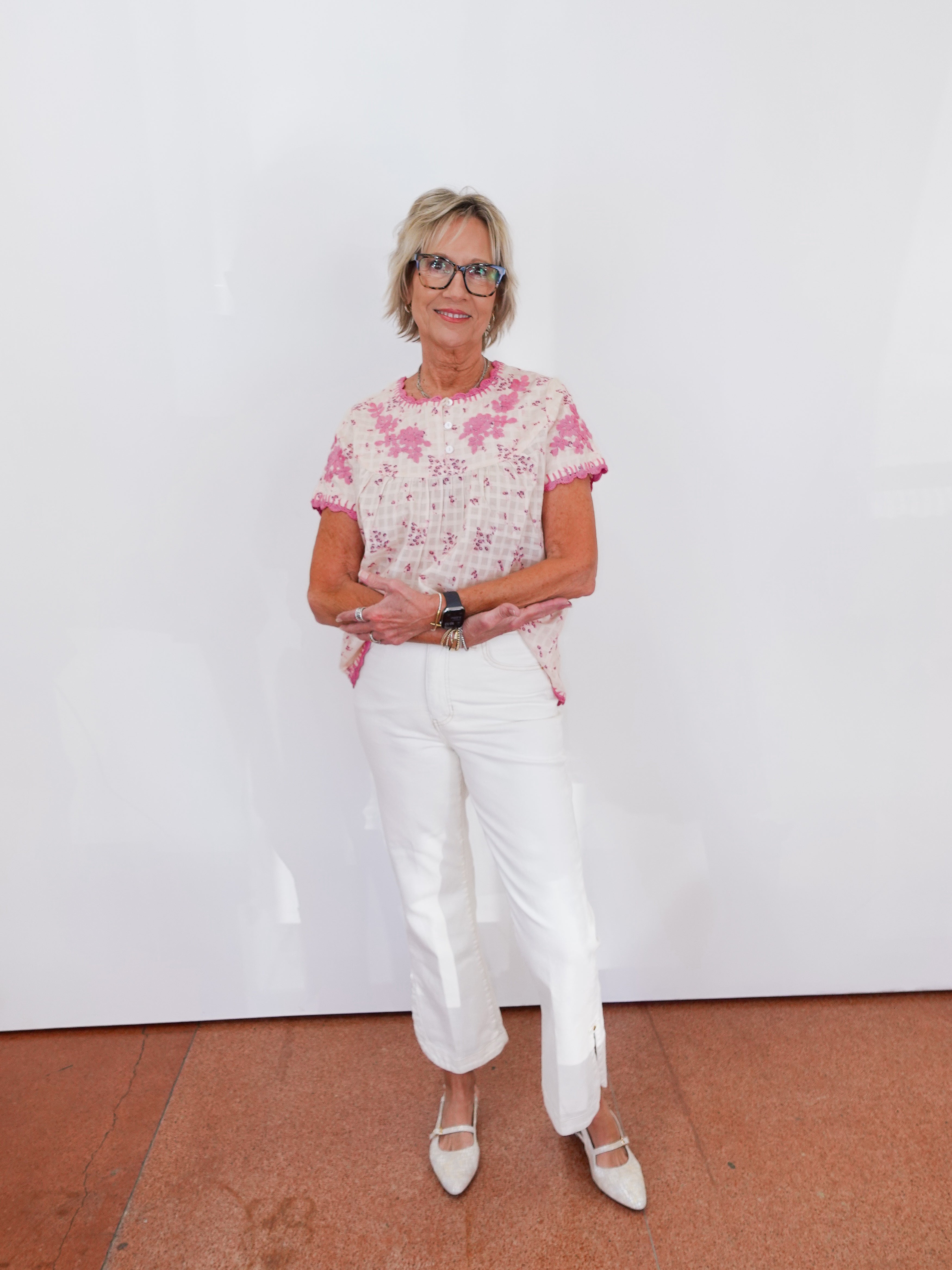 The Nora Blouse is one of those easy pieces that feels light, fresh, and just happy. The delicate floral embroidery paired with the pop of pink trim gives it that playful touch without overpowering your look.