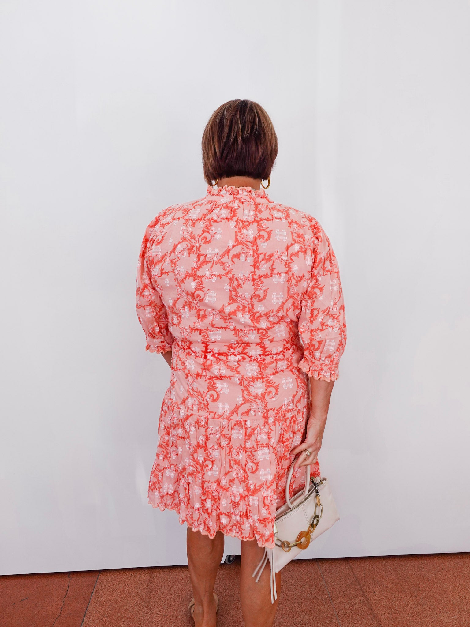 This is the dress you reach for when you want to look effortlessly polished but still playful. The delicate paisley print paired with the ruffled neckline and sleeve detail gives it that romantic charm without feeling overdone.