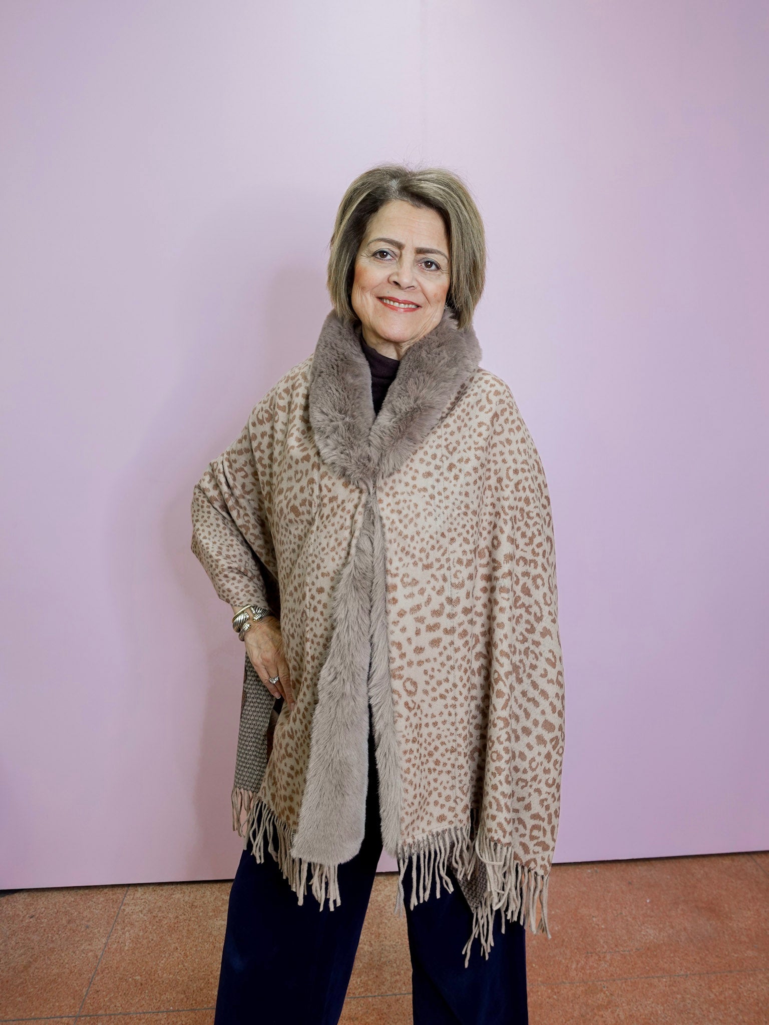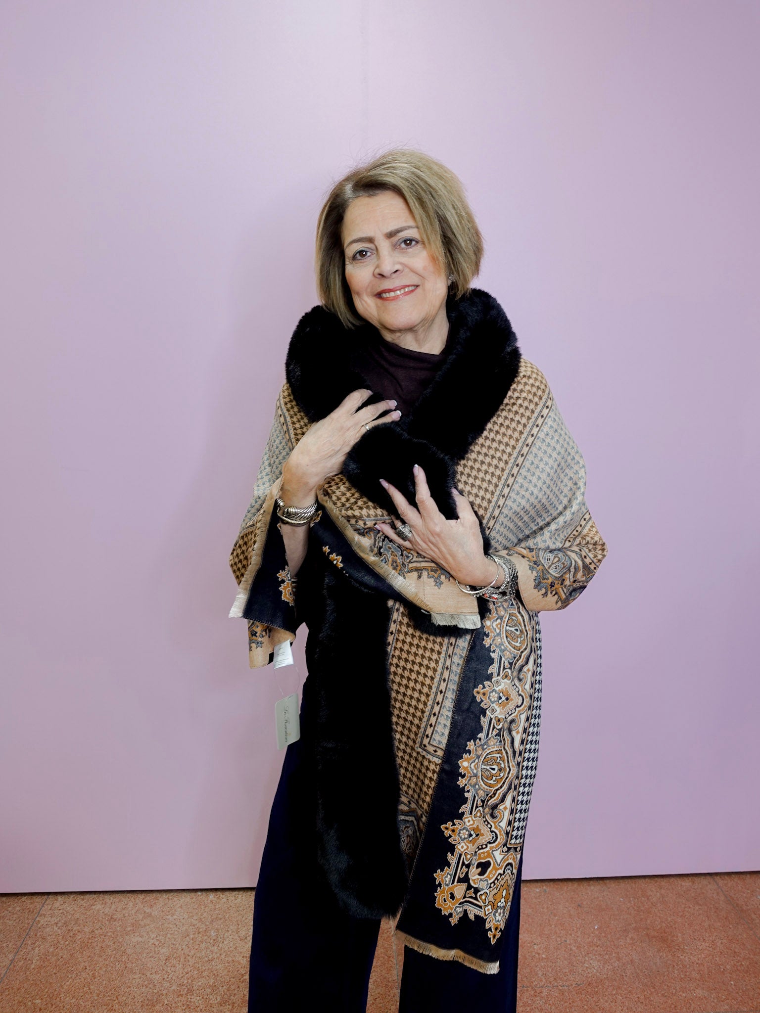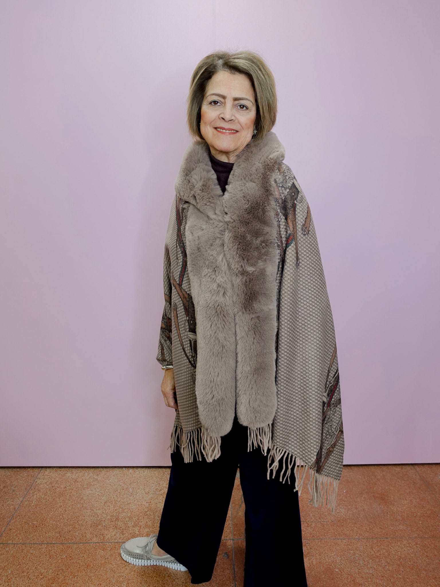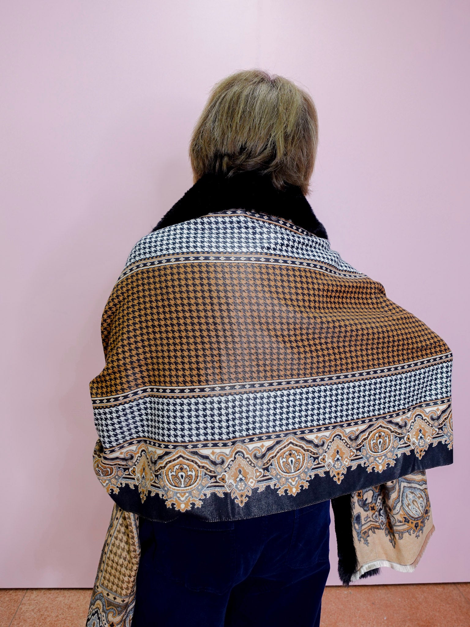 Houndstooth/Paisley Wrap W/ Faux Fur Trim