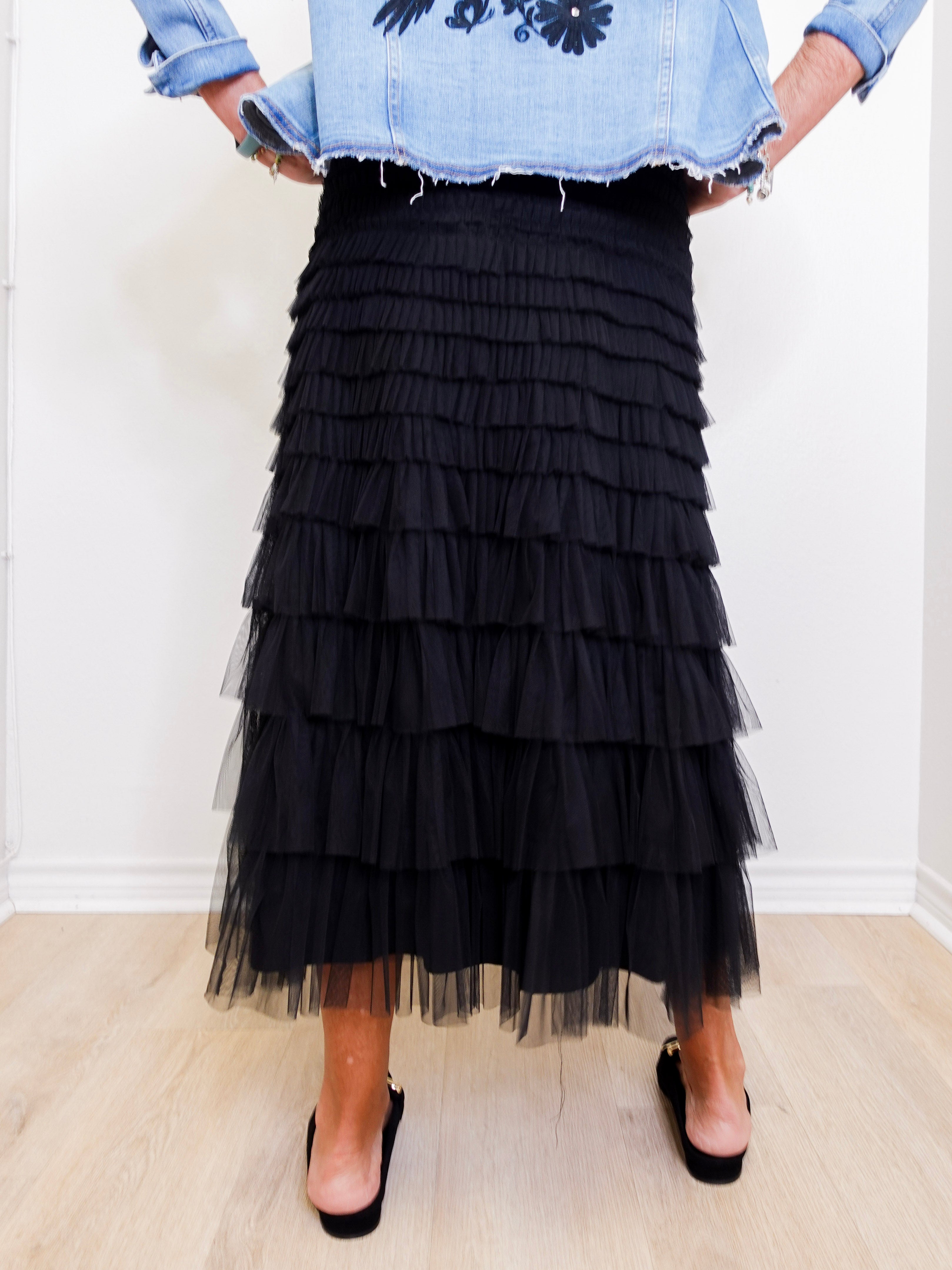 Add a touch of romance to your wardrobe with this dreamy black tiered tulle skirt. Fully lined for comfort, its soft layers create a floaty silhouette that moves beautifully with every step. Designed with an easy pull-on waist, this piece blends effortless wear with feminine charm—perfect for dressing up with heels or styling casually with sneakers.