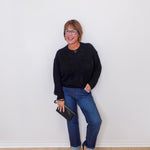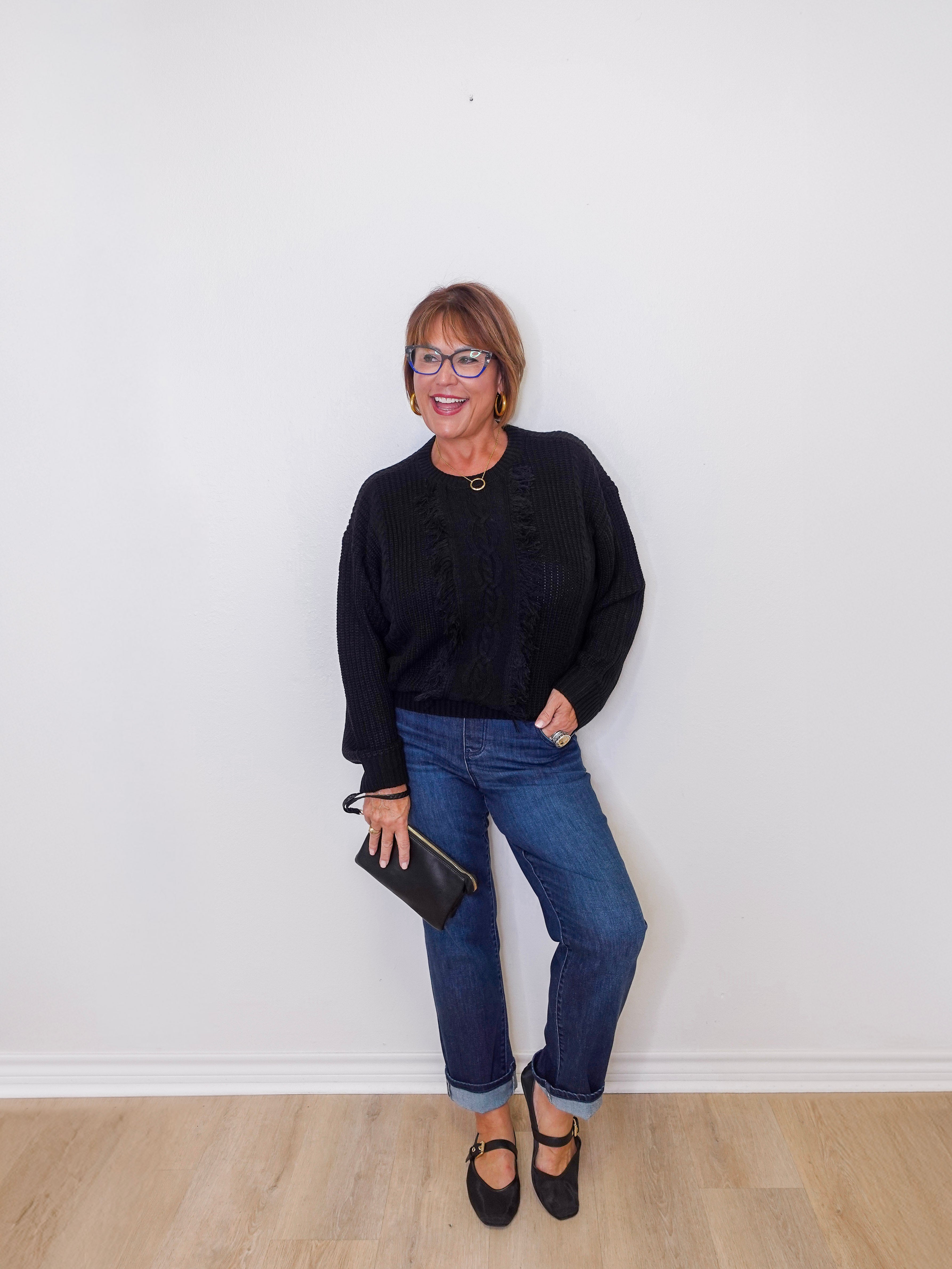 This sweater features a mock neckline, rib trim, and playful fringe detailing that redefines cozy with a statement twist. The perfect knit to pair back to denim or layer with polished separates for a look that feels both effortless and bold.