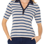 A modern staple with a playful twist. This collared Henley knit top delivers effortless polish with everyday ease. Designed in a soft, blue multi-stripe knit and finished with shirred half sleeves for a feminine touch. Functional buttons and a tailored collar elevate the look, making it perfect for layering or wearing solo.