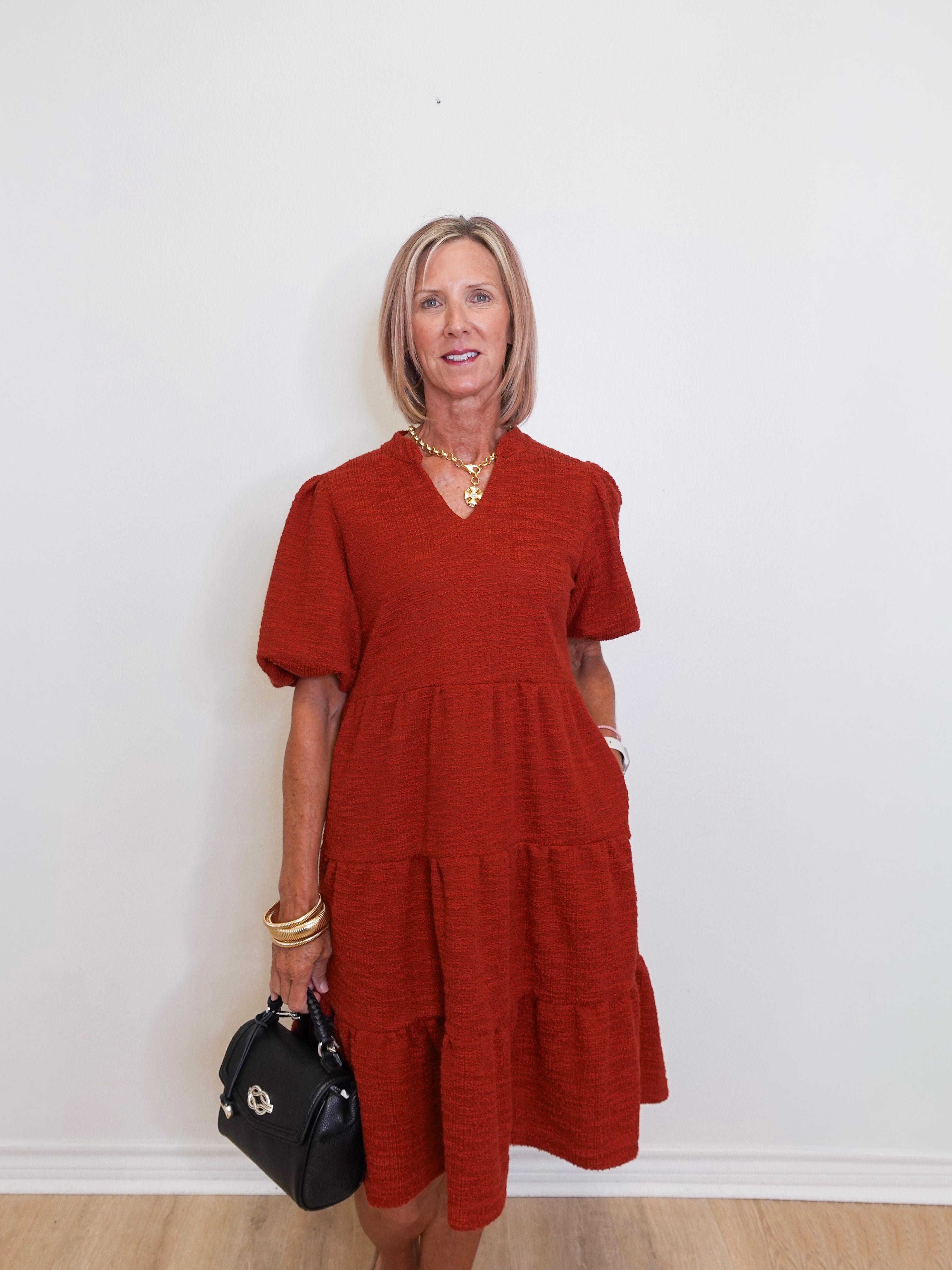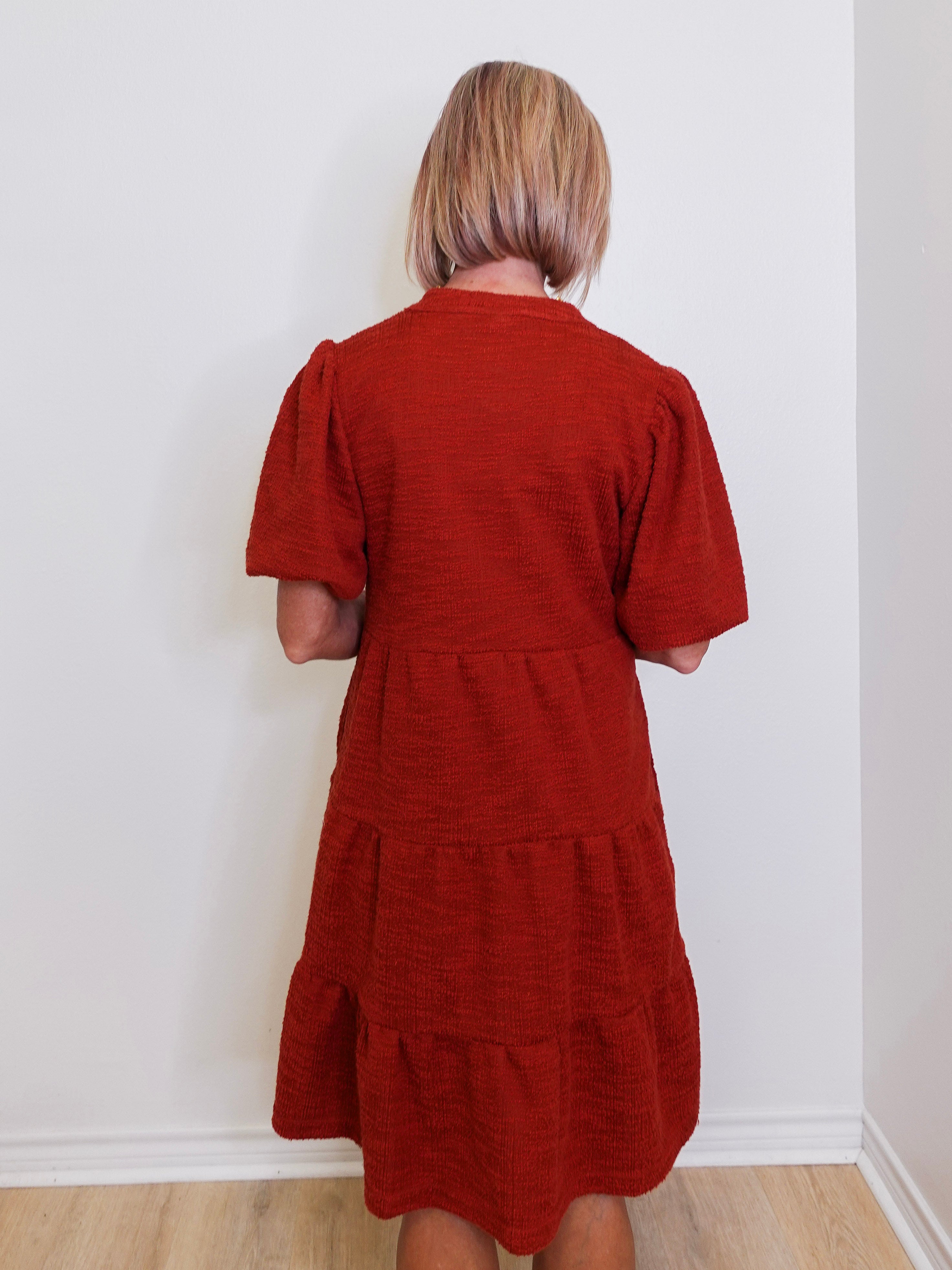 This tiered knit dress is an effortless blend of comfort and style, perfect for transitioning between seasons. Crafted from a soft knit blend, it features a flattering V-neckline, puff sleeves, and a tiered silhouette that moves beautifully with every step. The rich brick hue adds a warm, autumnal touch—ideal for pairing with boots, heels, or casual sneakers.