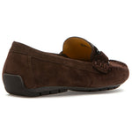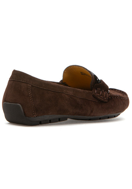 Ultra-soft glove leather moccasin. Matching chain accent. Padded leather insole. .25 inch rubber driving sole.