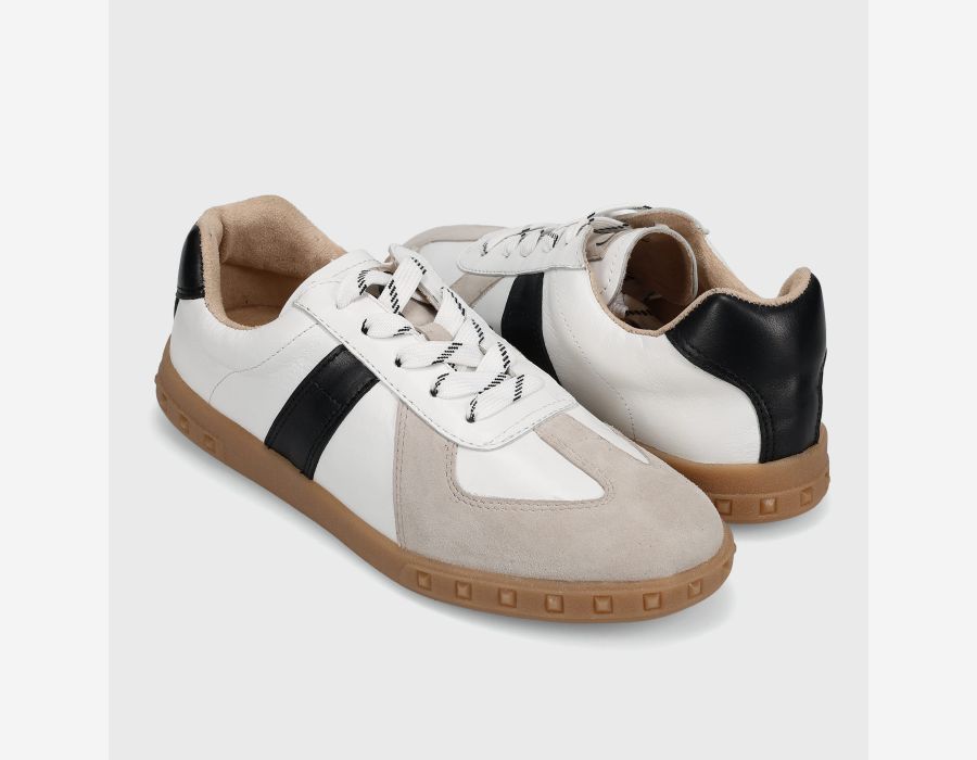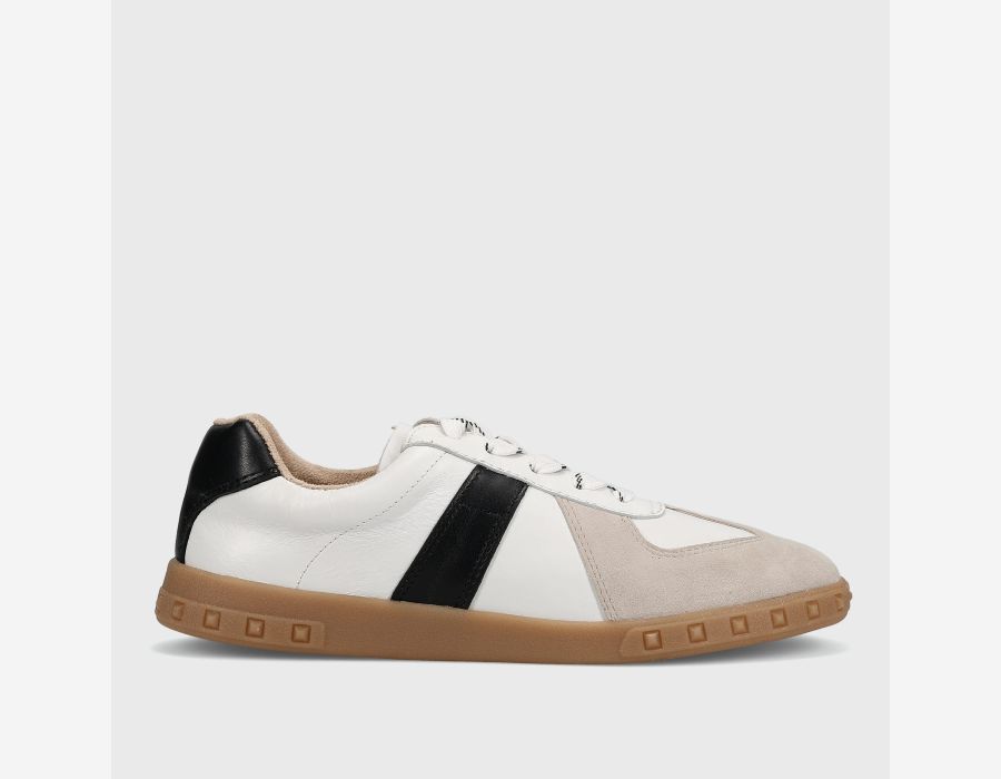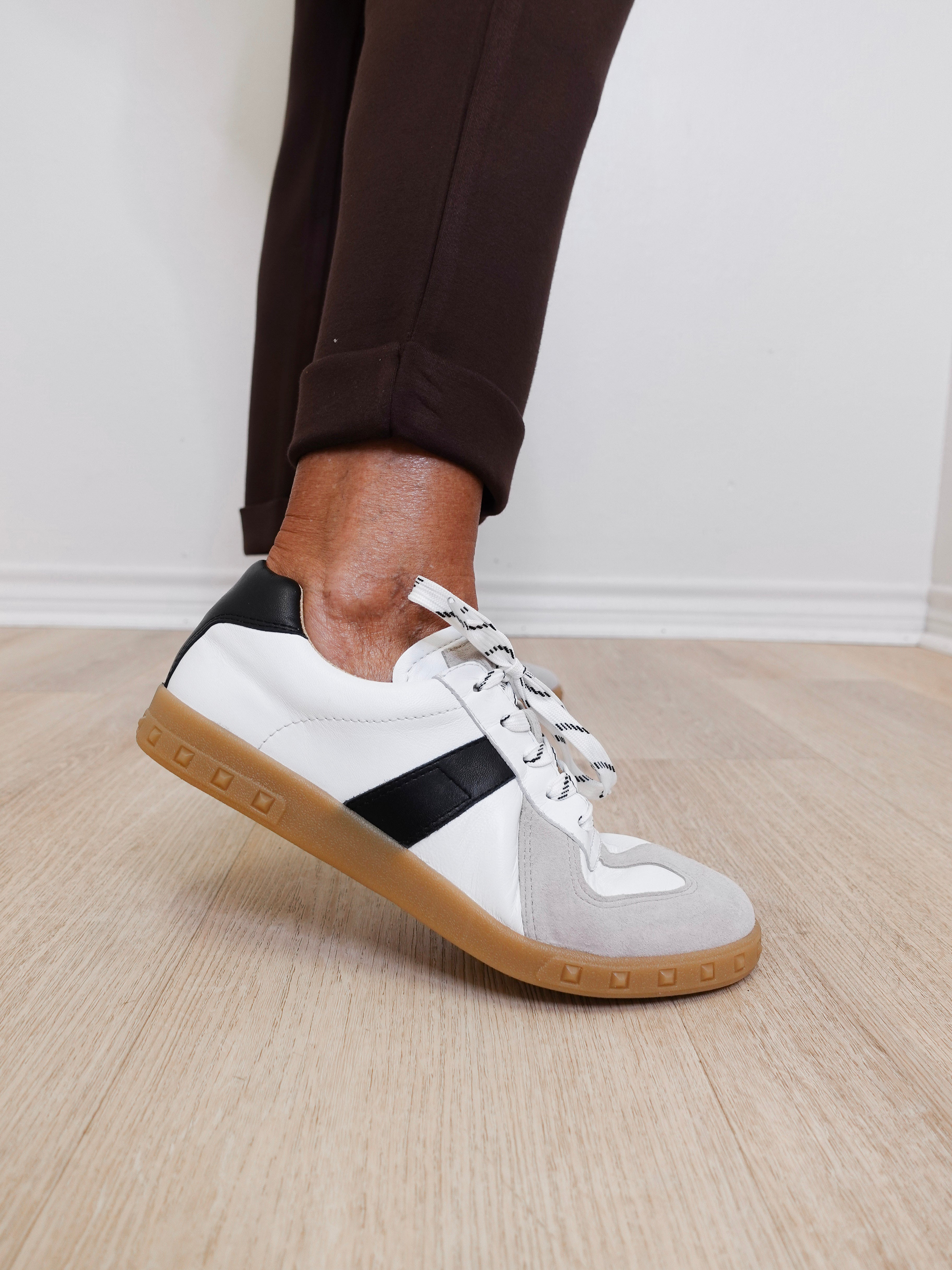Step into effortless style with this lace-up sneaker crafted from a luxe mix of smooth leather and soft suede. Designed with a contrast black accent stripe and grounded on a classic gum sole, this versatile sneaker pairs well with everything from denim to dresses. The removable padded insole ensures all-day comfort, while the 1" rubber sole adds just the right amount of lift.