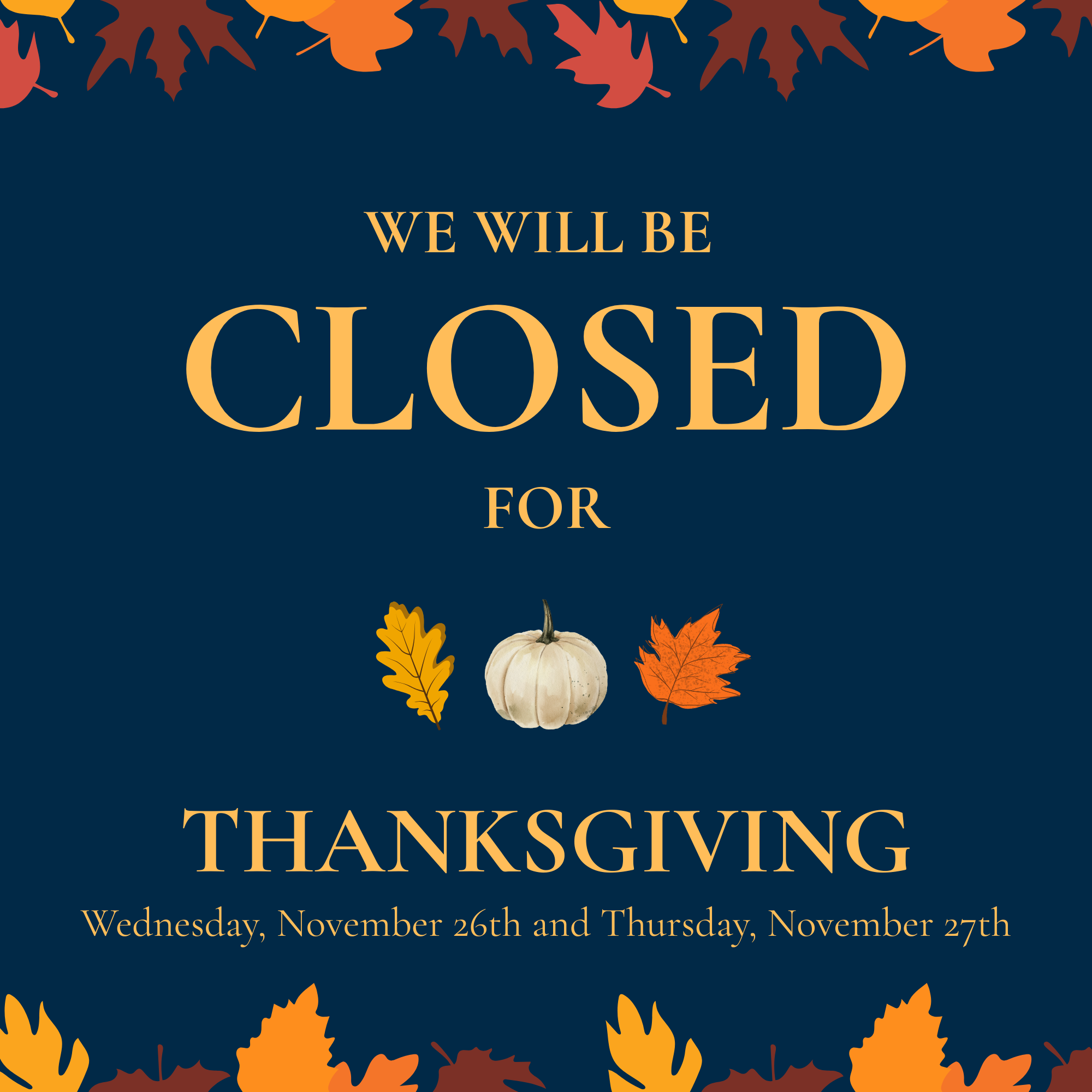 We will be closed on Thanksgiving Day to celebrate with our families. Happy Thanksgiving!