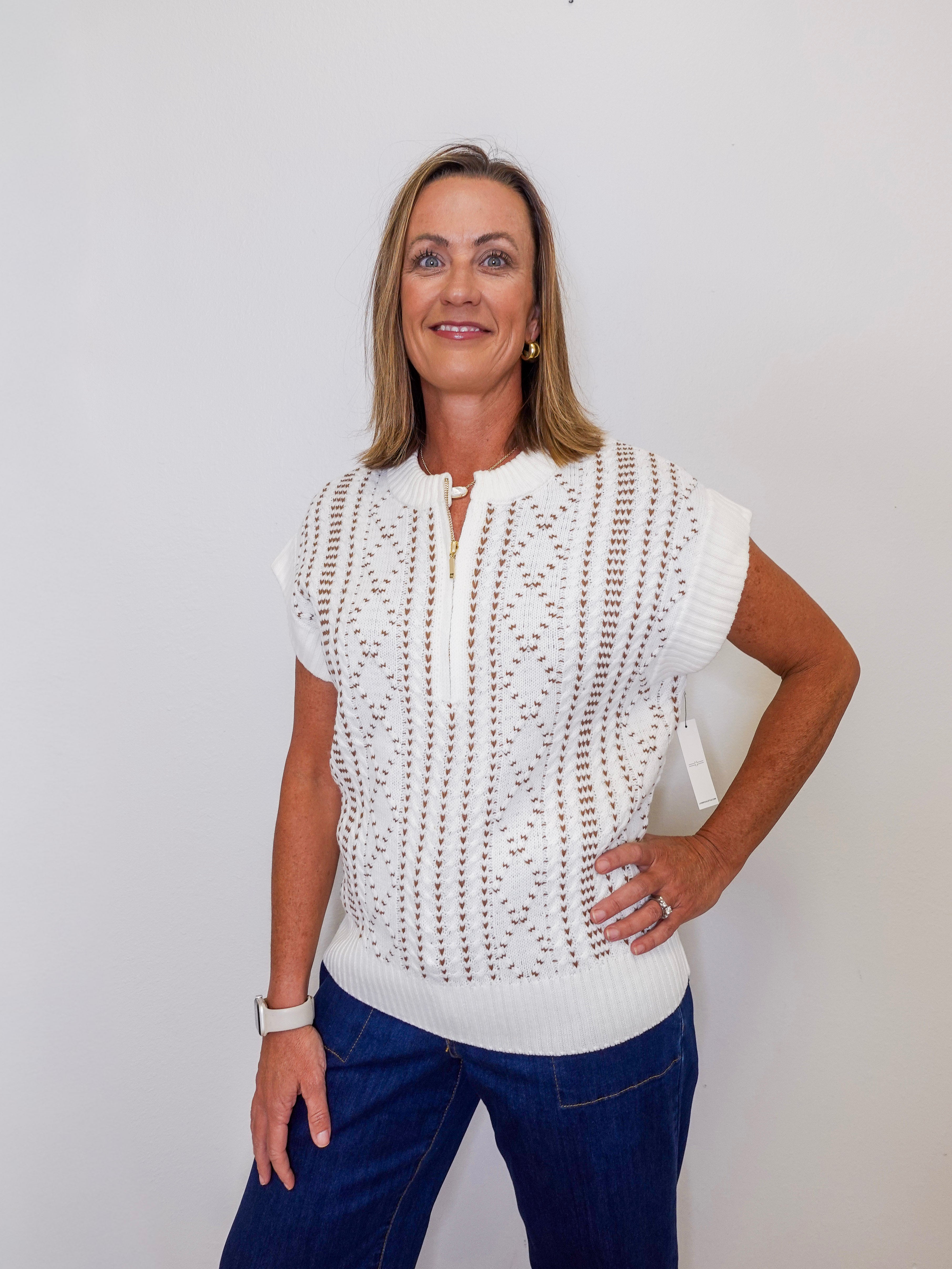 Cozy meets cool in this cream and camel striped zip-knit top!