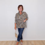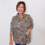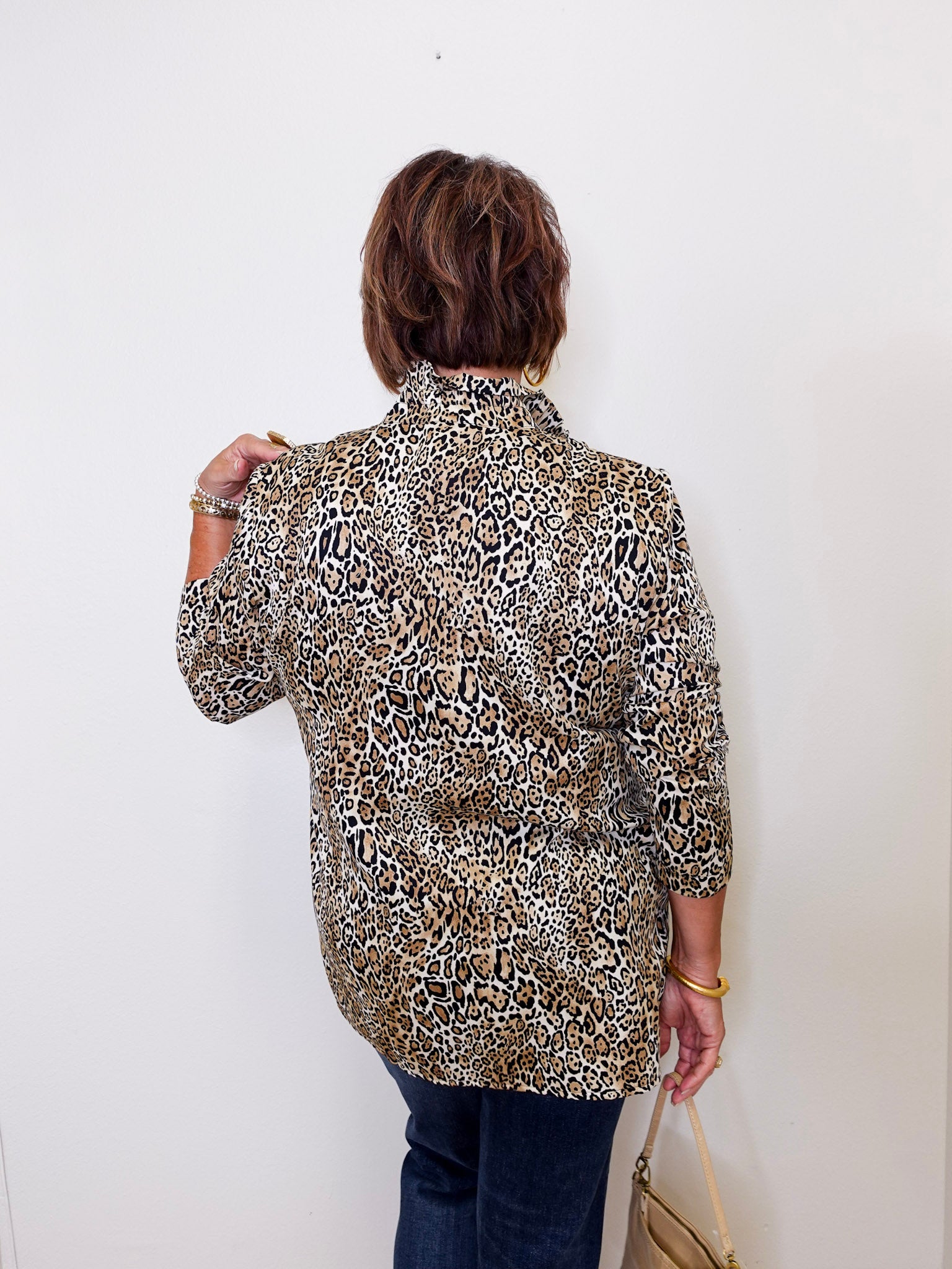 When a wild twist meets Carolina’s signature polish, this must-have gets a bold new look. One of our bestselling silhouettes — loved for its comfort, versatility and ease — returns in an allover variegated brown leopard print for a fresh, unexpected take on the classic animal pattern. Thoughtful details like a softly gathered neckline and pearlized buttons add an elevated touch. Lightweight yet structured, it layers beautifully or stands on its own for instant impact.